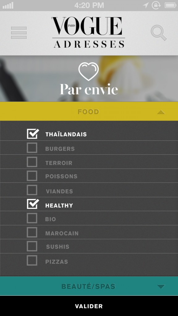 La recherche est simple par mots-clé, envie ou directement par thématique (Food – Beauté/Spas, Hôtels).