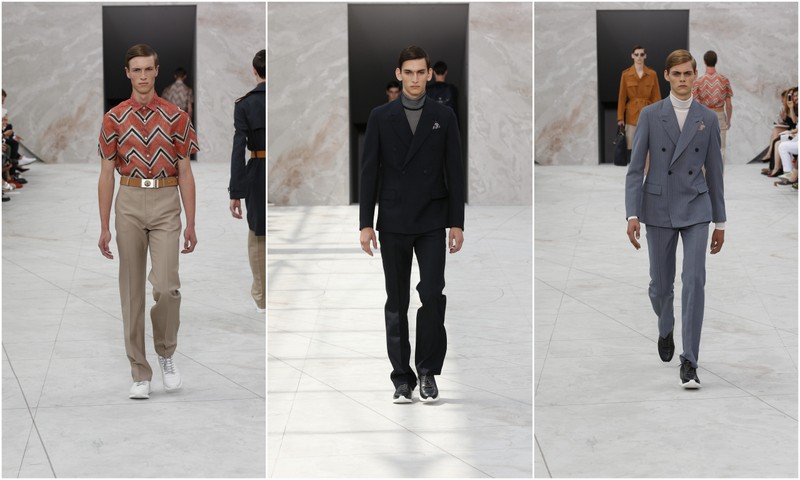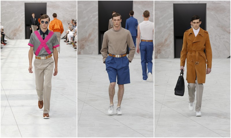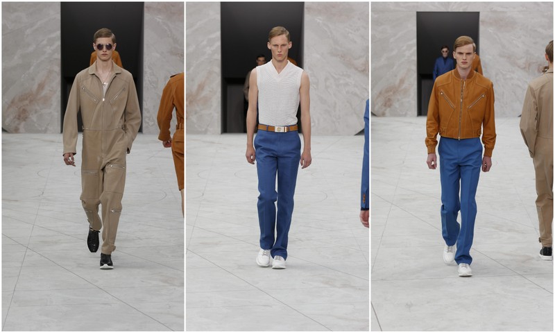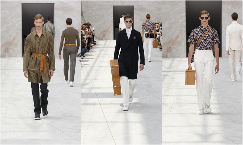 Au fur et à mesure que le voyage progresse, la silhouette se fait moins formelle pour céder la place à un sportswear chic de circonstance. Les costumes à taille haute et les polos s’effacent au profit de tenues plus casual, avec des ensembles bermudas et chemises avec poches et rabats sur les épaules, de bermudas et autres pantalons légers inspirées des tenues des gardiens des palais des maharadjahs.