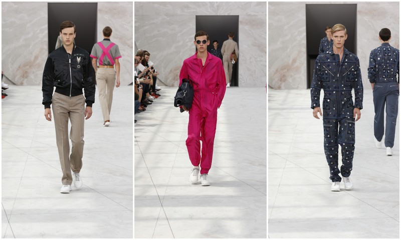 Les références militaires sont légion. Bombers et combinaisons évoquent la Royal Air Force dans un mélange de rigueur et de sportswear chic des plus savoureux. La combinaison est plébiscitée proposée dans trois visions des plus modernes, osant même dans une ultime pointe d’audace le rose intégral.