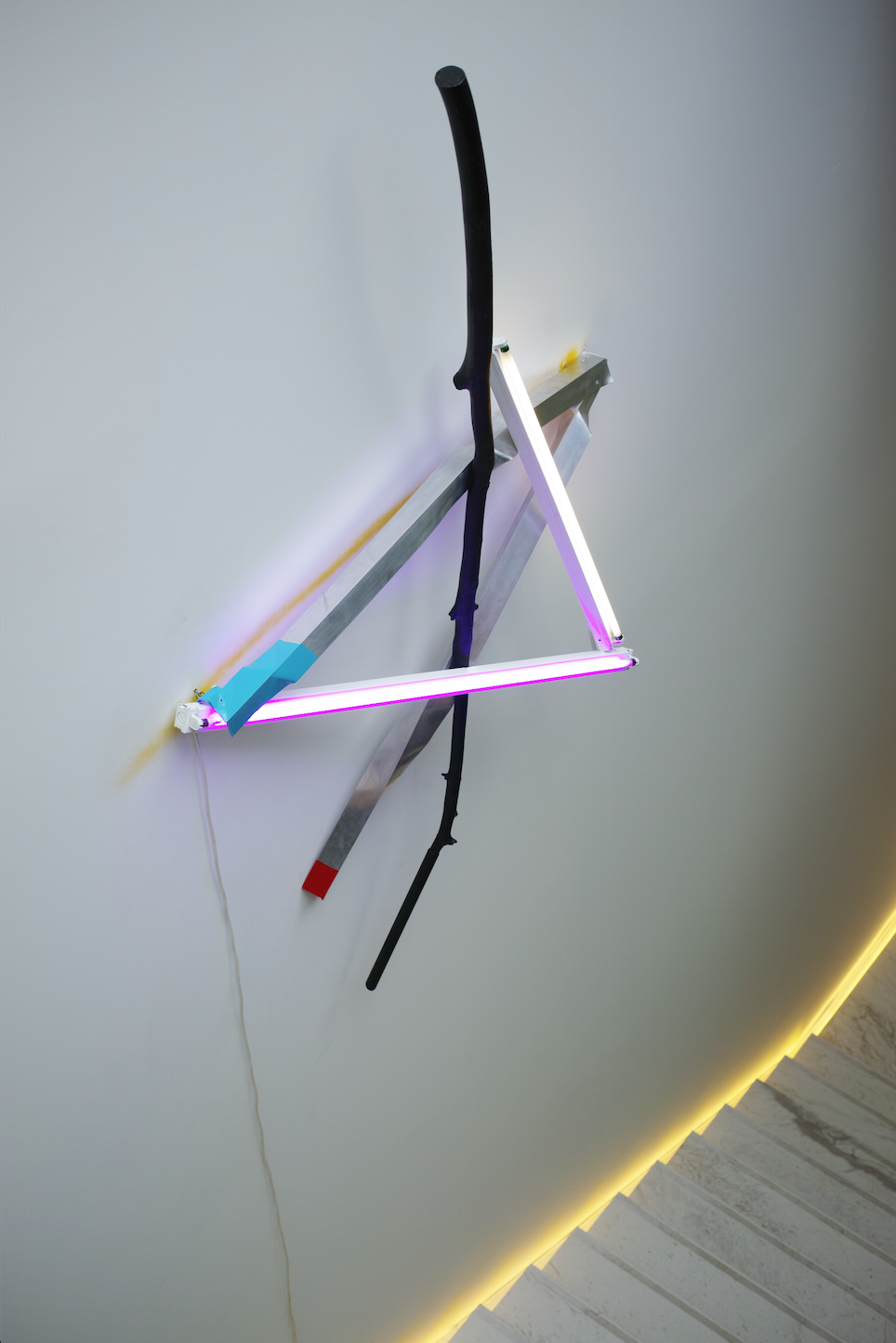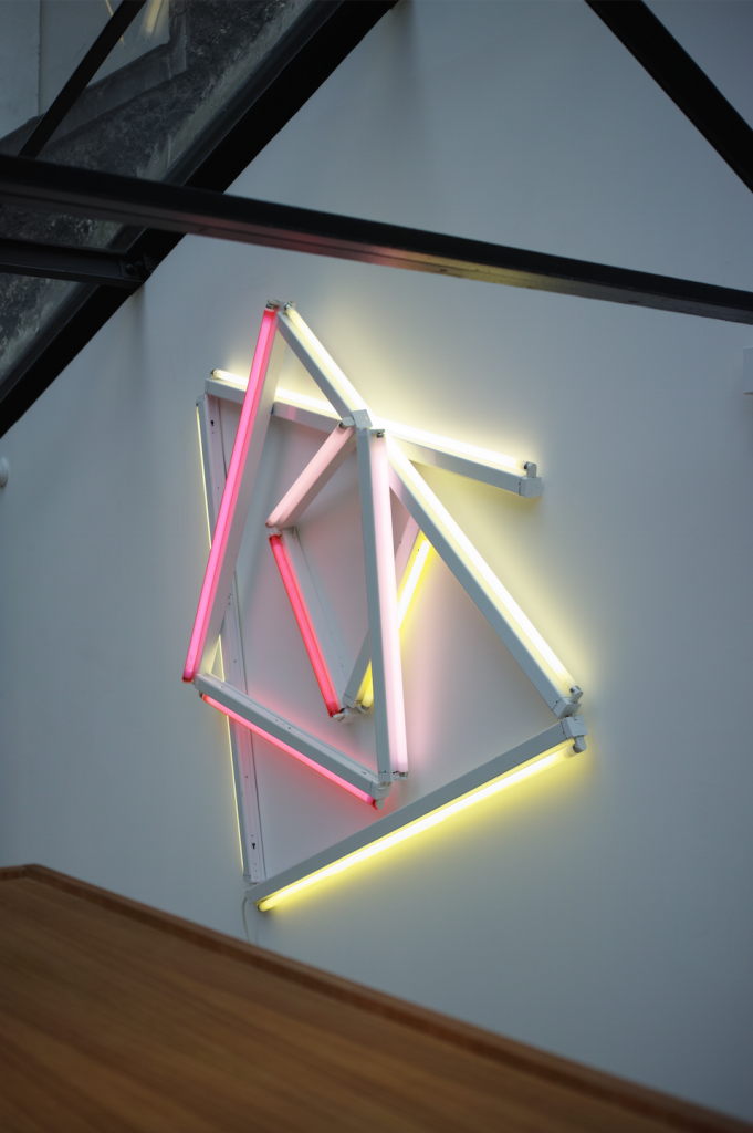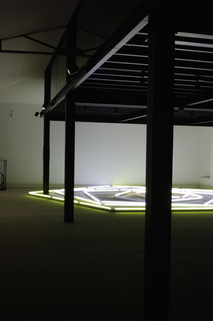 Souvent tramées de lumières phosphorescentes, les sculptures de l’artiste jouent avec la structure même du Studio des Acacias habitant l’espace, comblant les vides.