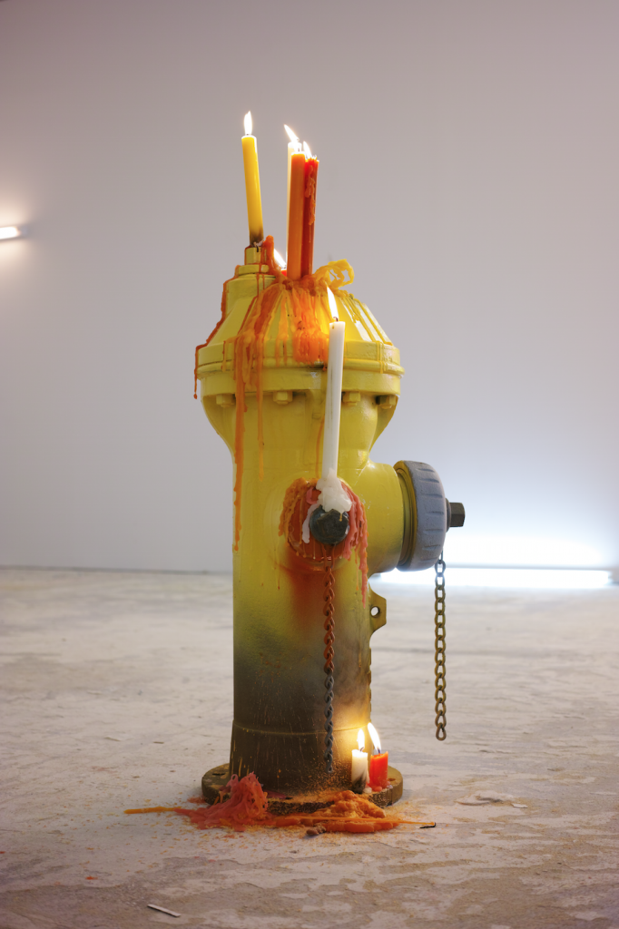 Une borne d’incendie couverte de peinture chaude et de bougies allumées se prend de contradiction devenant elle-même un incendie symbolique, celui de l’état d’Iowa.