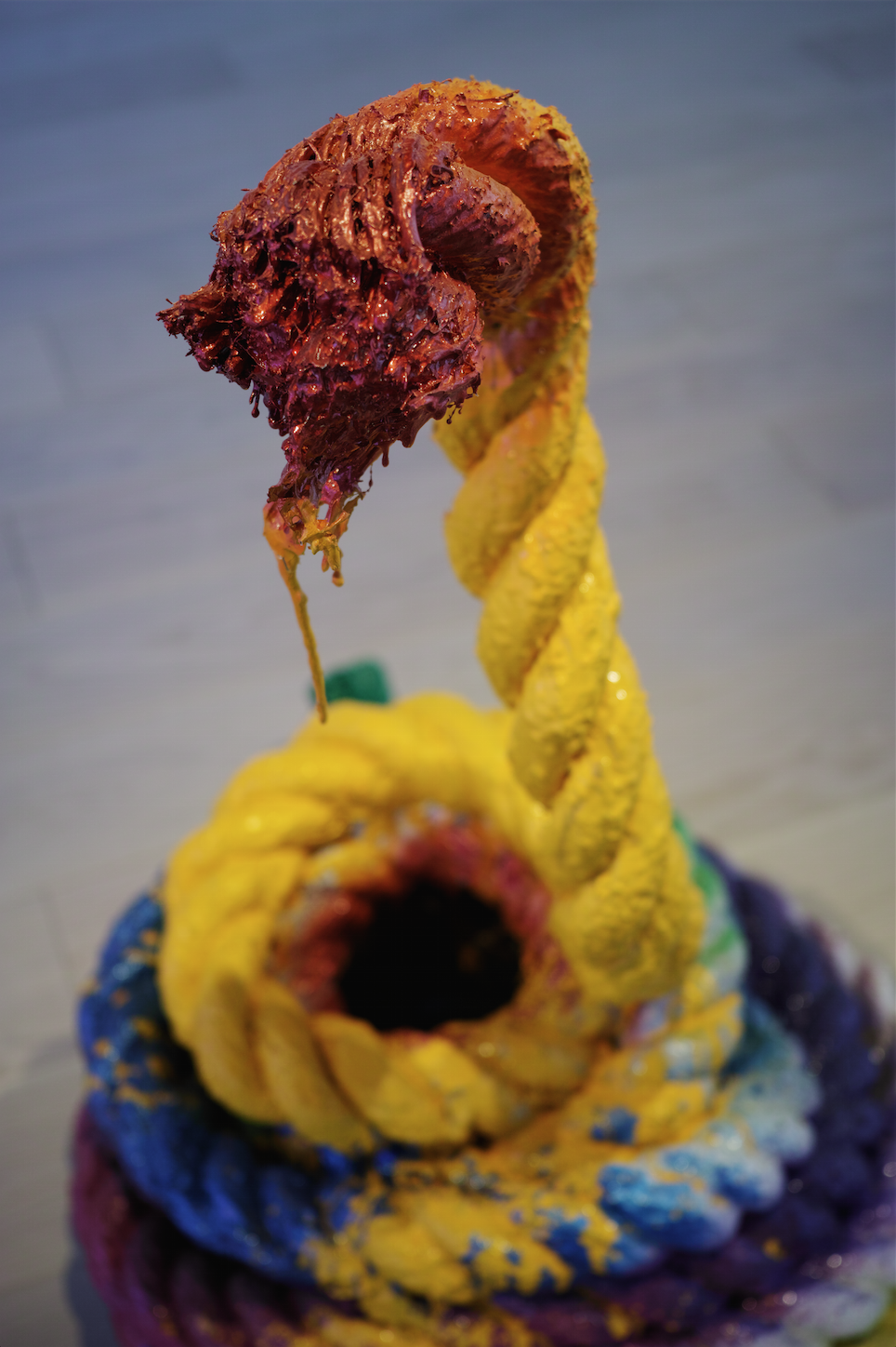 Une simple corde usée recouverte de peintures devient un cobra multicolore qu’on imagine danser au son d’une musique hypnotique pour mieux s’extirper de la rigidité du quotidien.