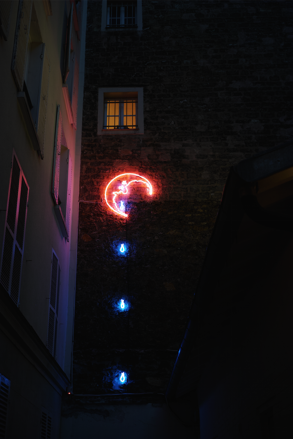 Un nouveau paysage apparaît, incandescent, paysage renvoyant à l’image d’une grande ville perpétuellement sous éclairage. Des néons du quotidien se parent ainsi de couleurs pour devenir l’impression fugace du reflet d’une lune.