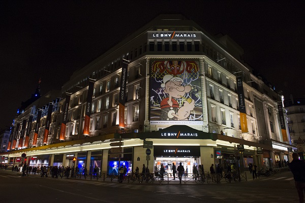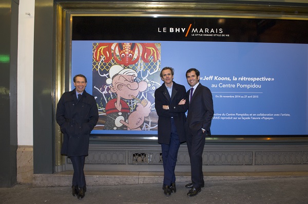 Le mardi 25 novembre, l’artiste américain Jeff Koons est venu poser devant son œuvre Popeye, exposée sur la façade du BHV Marais depuis le 12 novembre. L’artiste américain est également venu remercier Guillaume Houzé, Directeur de l’Image et de la Communication des Galeries Lafayette et du BHV Marais, instigateur du projet avec la complicité d’Alain Seban, Président du centre Pompidou.