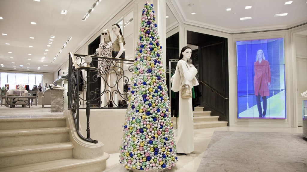 Après le sapin très fleuri de l’année dernière, Raf Simons a imaginé cette année un grand arbre de bulles multicolores pour la maison Dior. Afin de rappeler l’univers de la maison de couture française, la teinte grise domine l’ensemble.