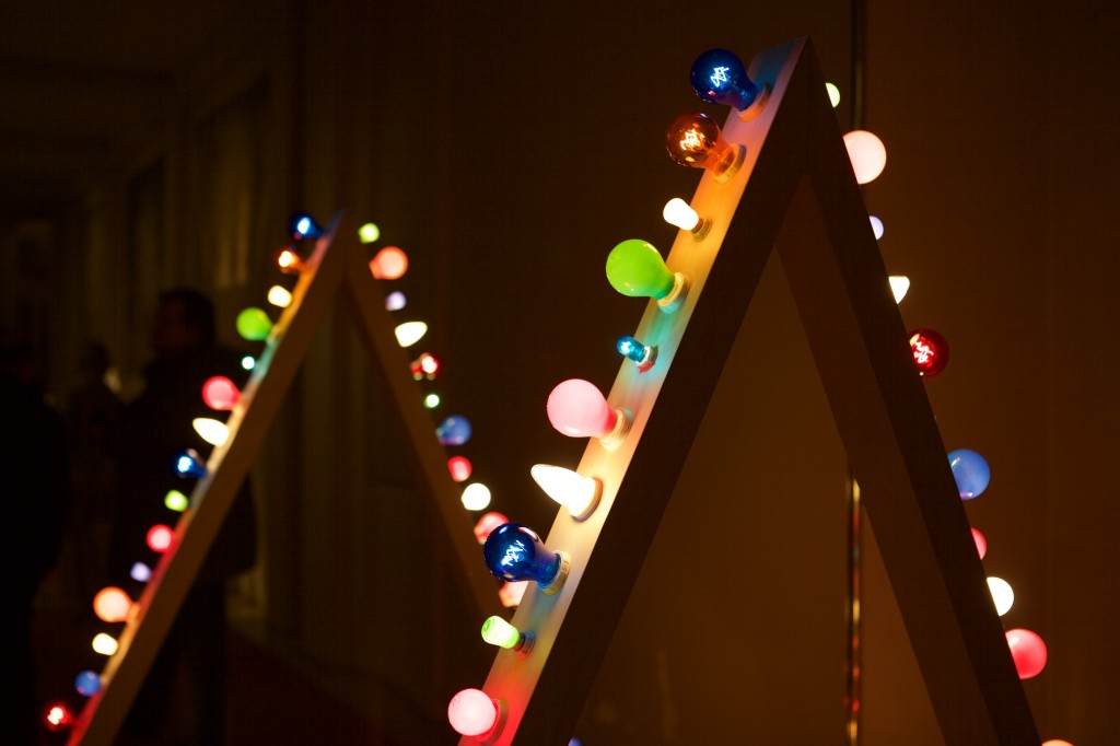 Chaque année, la créatrice Stella McCartney imagine le plus lumineux des sapins de Noël au travers d’un sapin minimaliste en bois blond souligné d’ampoules de fêtes multicolores.