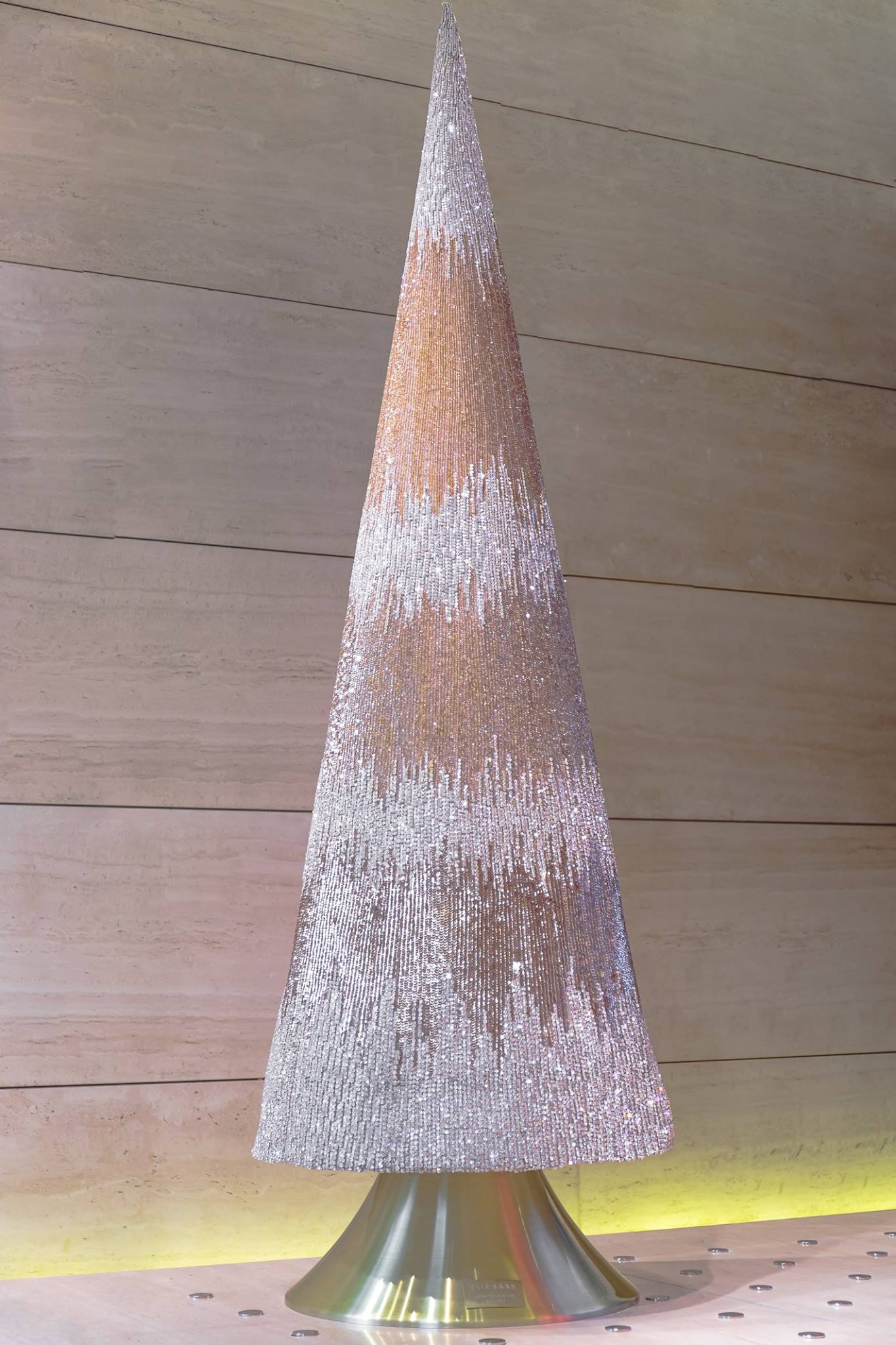Le couturier Elie Saab a imaginé un sapin robe du soir avec une étoffe haute-couture aux fines broderies infiltrées de lucioles dorées.