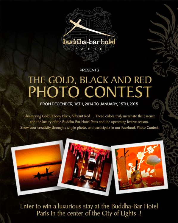 Jusqu’au jeudi 15 janvier 2015, le Buddha-Bar Hotel Paris récompense ses fans les plus fidèles avec un jeu-concours photo avec à la clé un séjour pour deux personnes à gagner ! Laissez libre cours à votre imagination et à votre sens artistique en proposant votre plus belle photo autour du thème Or, Noir et Rouge, hommage aux couleurs qui incarnent le Buddha-Bar Hotel Paris.