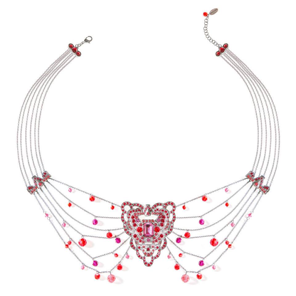 Colliers, boucles d’oreilles, bagues et bracelets parés de pierre de Swarovski Indian Pink, Rose et Light Siam, également disponible en champagne.