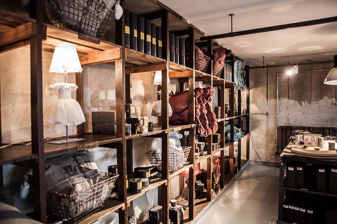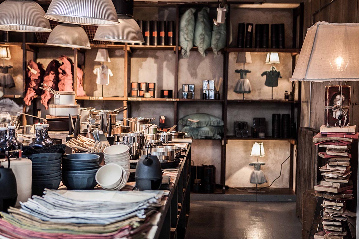 Dans une atmosphère brute et industrielle mêlant produits nobles et meubles de récupération, les mille et un trésors de Borgo Delle Tovaglie, fabriqués à la main en Italie, se révèlent.