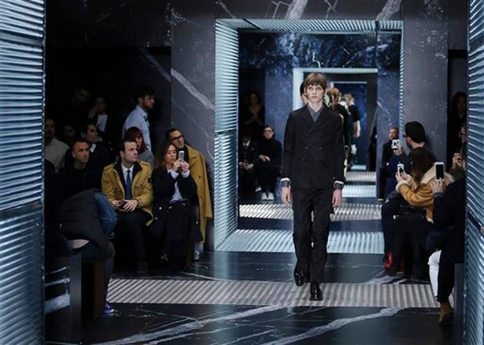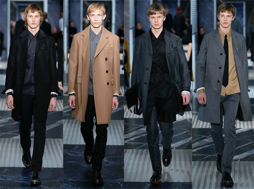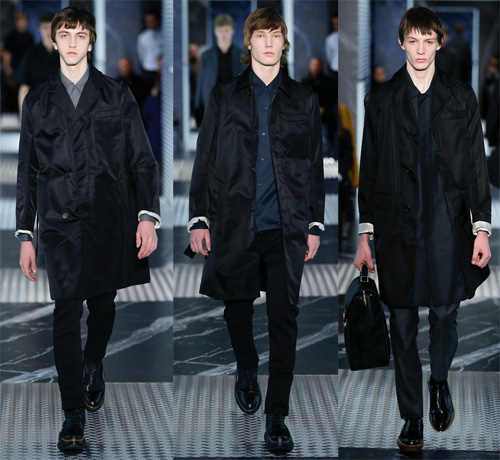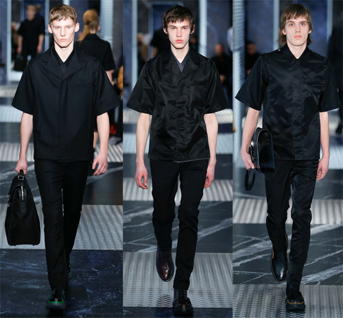 Essentiellement dominée par des teintes sombres, la collection Automne-Hiver 2015-2016 de la Maison Prada interroge sur les différentes interactions des modes masculine et féminine et sur la manière dont elles se nourrissent l’une et l’autre.