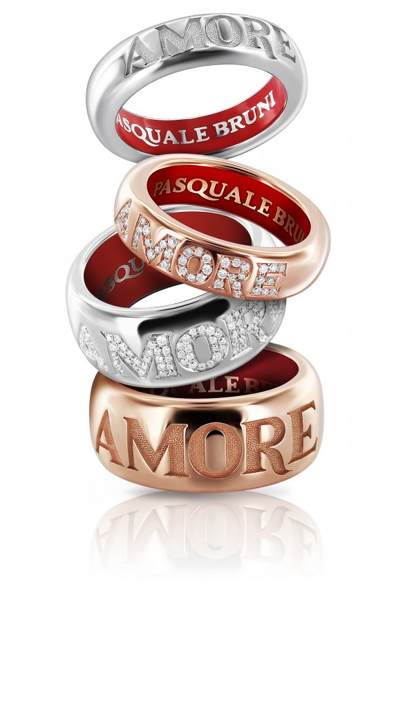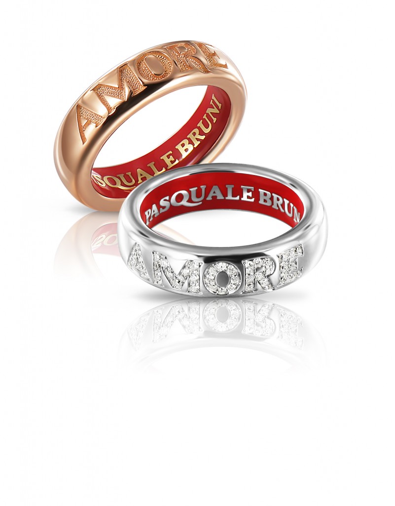 Les bagues joncs gravées du mot amore sont doublées d’émail rouge sur lequel viennent se poser en or Pasquale Bruni et un cœur. Et pour faire succomber votre belle à coup sûr, les joncs existent en version or rose ou blanc, avec ou sans diamants.