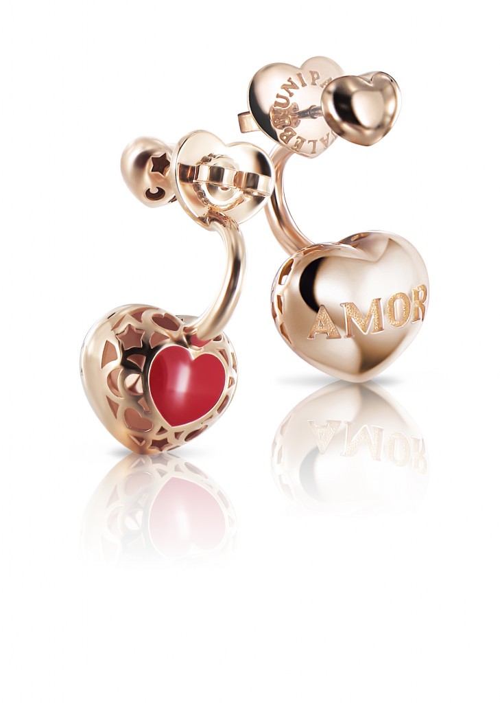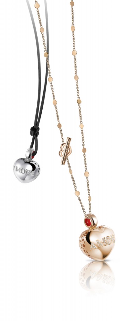 SI votre belle préfère les colliers, les pendentifs et les boucles d’oreilles la séduiront par leur design tout en bombé rappelant un cœur avec une petite touche d’émail rouge. Amore est gravé sur la partie apparente des bijoux et au verso on retrouve, telle une dentelle d’or, les motifs maison : cœur, étoile et lune.