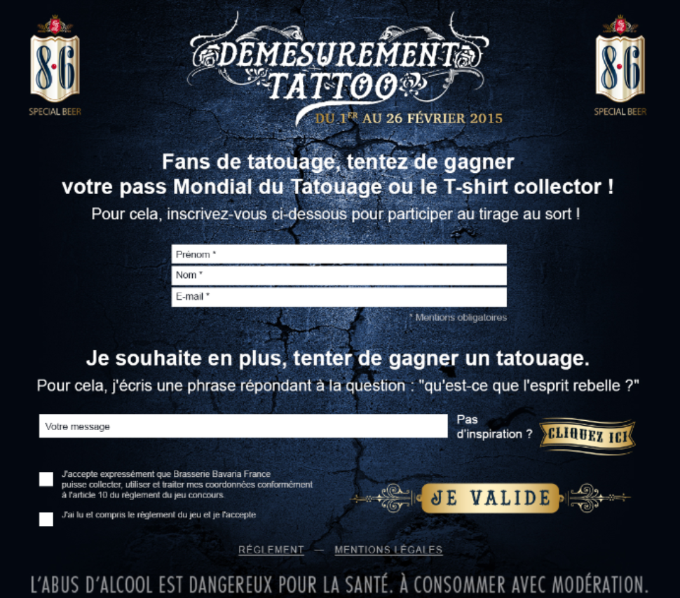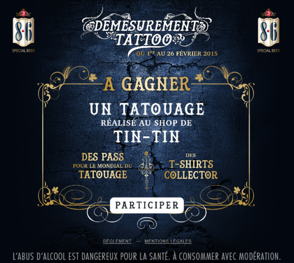 A cette occasion, la marque de bière à l’esprit rock et rebelle propose aux internautes un grand jeu-concours Démesurément Tattoo sur sa page Facebook ! Ce jeu-concours offrira à un fan de tatouage la possibilité de voir son rêve devenir réalité dans l’un des shops les plus réputés de France, celui de Tin-Tin, organisateur du Mondial.
