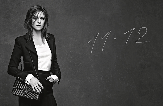Plus classique, Kristen Stewart incarne en toute élégance le sac 11.12, le classique doté du célèbre fermoir au double C. L’actrice – qui vient de recevoir le César de la meilleure actrice dans un second rôle pour Sils Maria d’Olivier Assayas – sûre d’elle et élégante en tailleur en crêpe de soie noir et petit haut blanc, apporte une petite touche de modernité à la valeur sûre de la maison revisité cette saison en cuir d’agneau à matelassage chevrons.