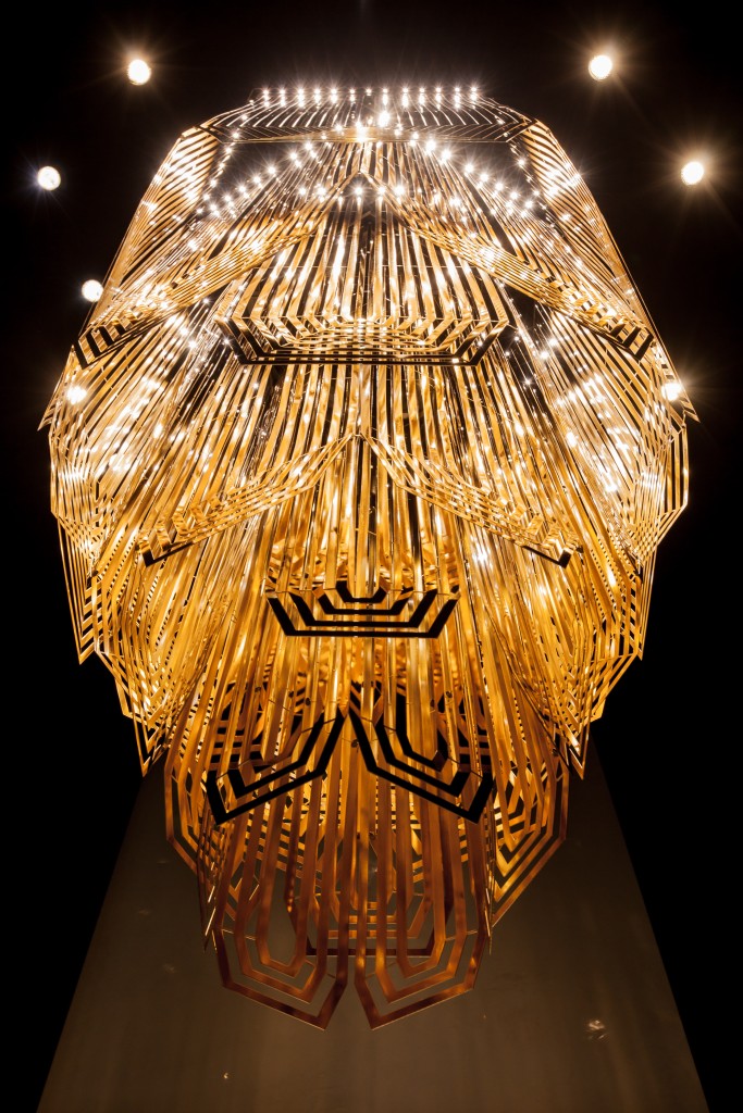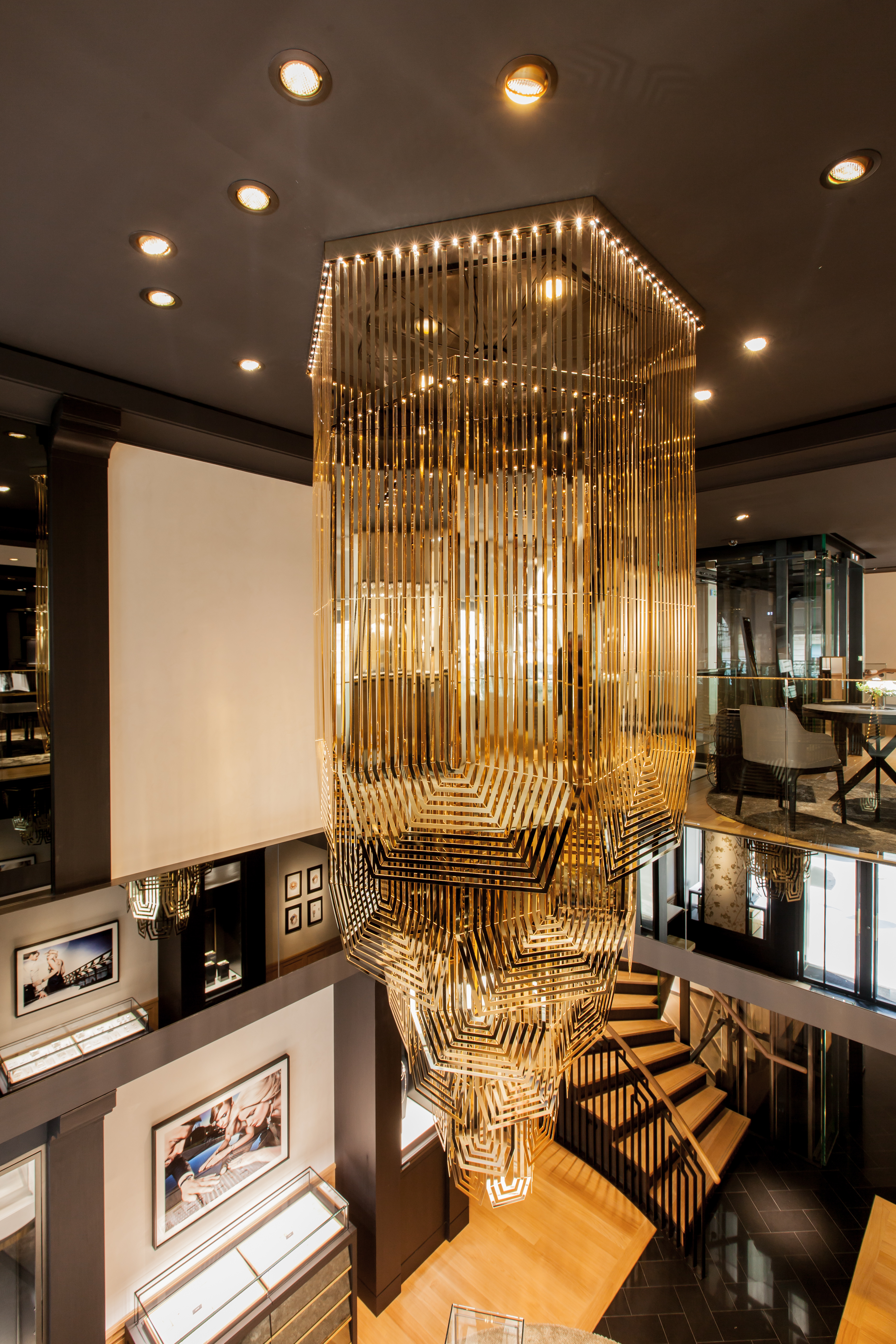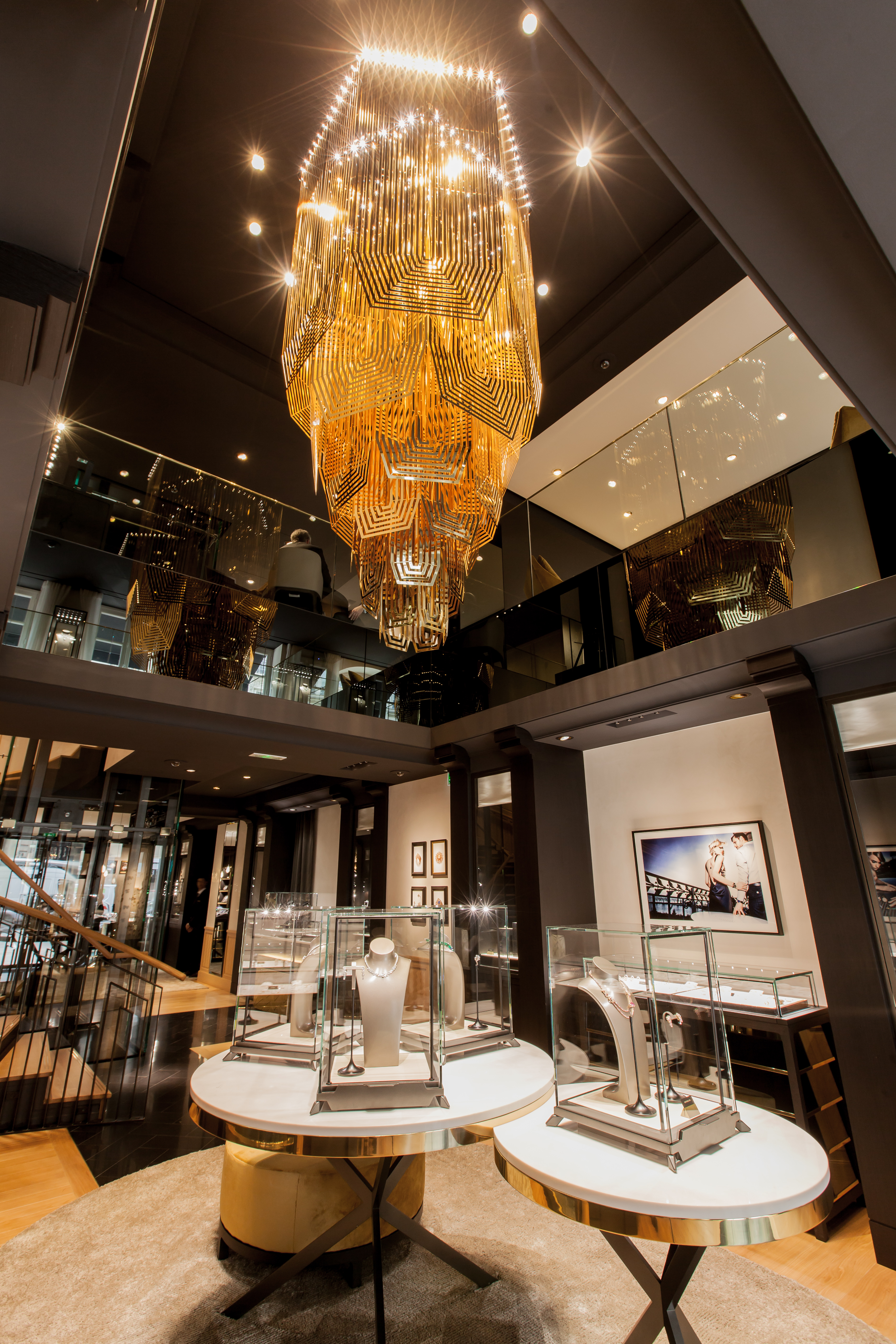 Levez les yeux et admirez le somptueux lustre stylisé de 3,50 mètres qui vous invite d’un regard à monter au balcon ouvert du premier étage. Non loin, la vitrine icône aimante le regard, enchâssée dans sa mosaïque à la feuille d’or exécutée par une ancestrale entreprise familiale italienne.
