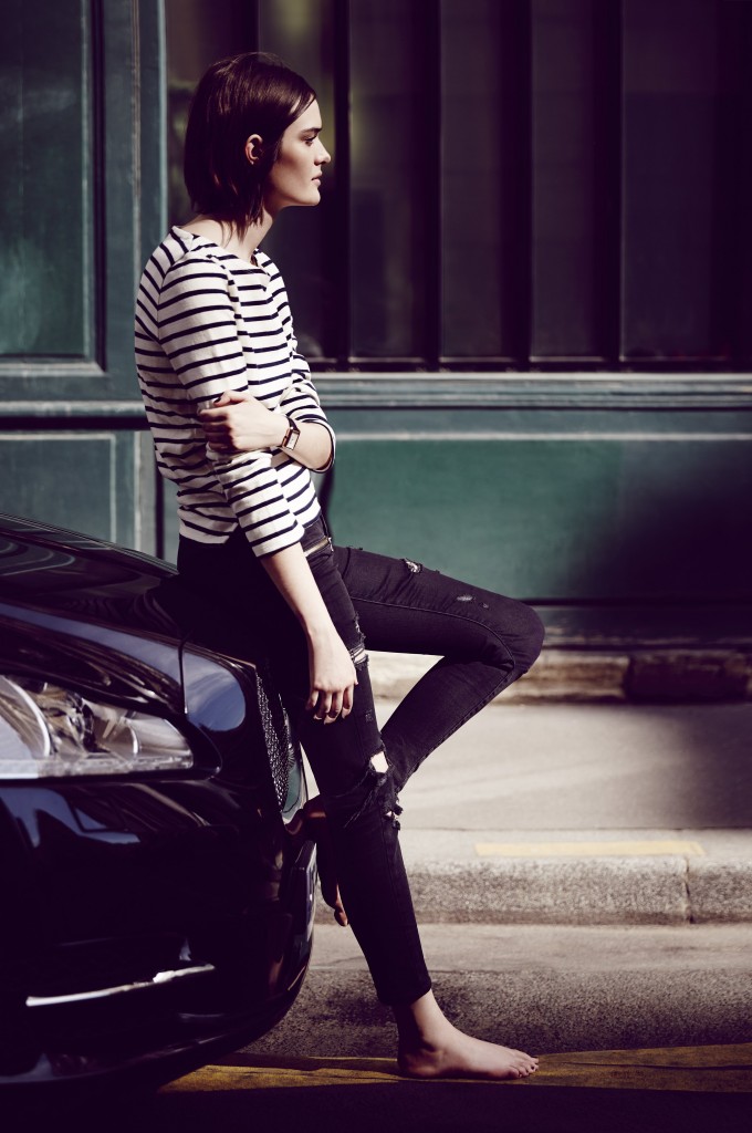 Ultime détail masculin : ce bracelet en alligator semi-mat doté d’une boucle ardillon ou triple déployante, généralement réservé à l’homme qui, ici révèle la plus brûlante des féminités.