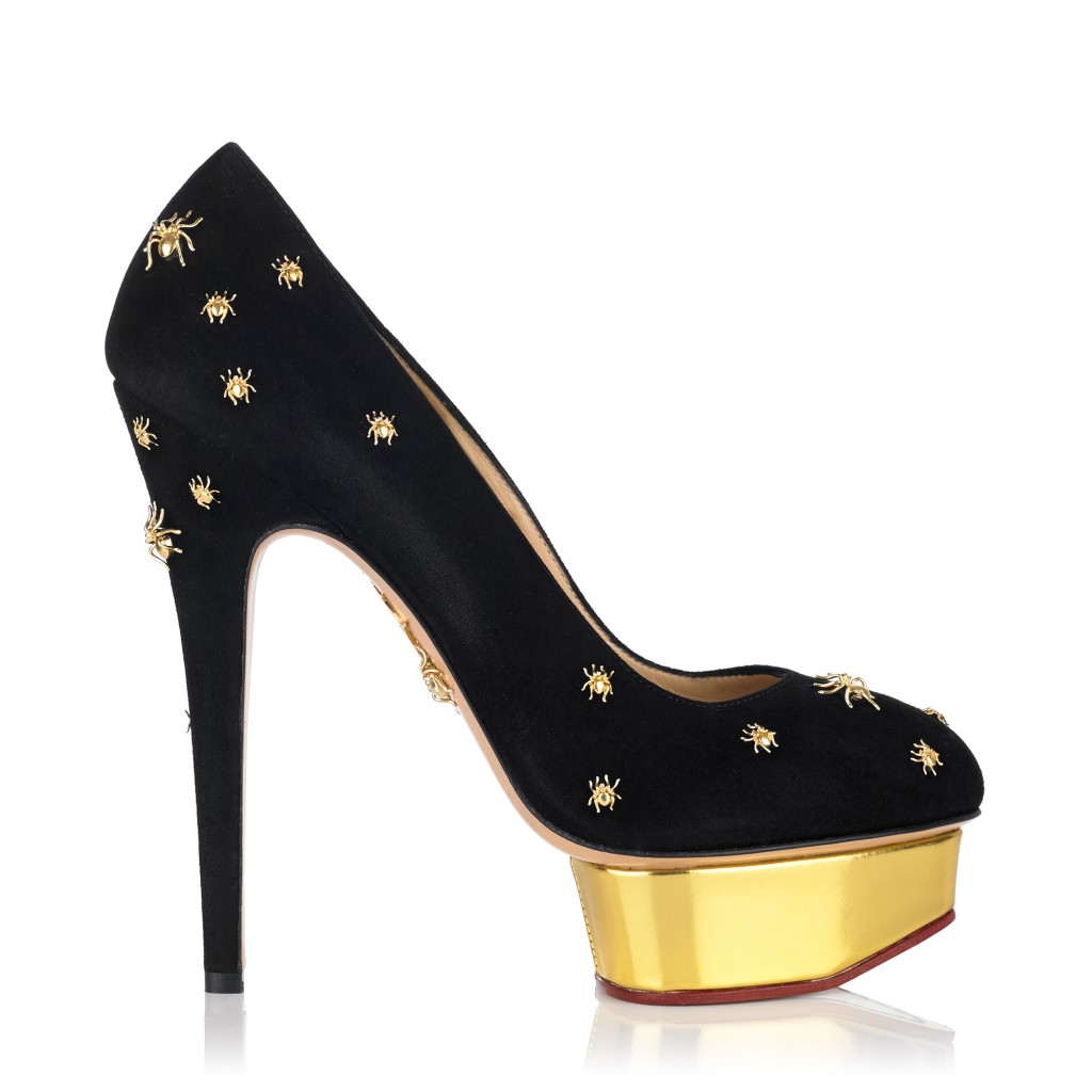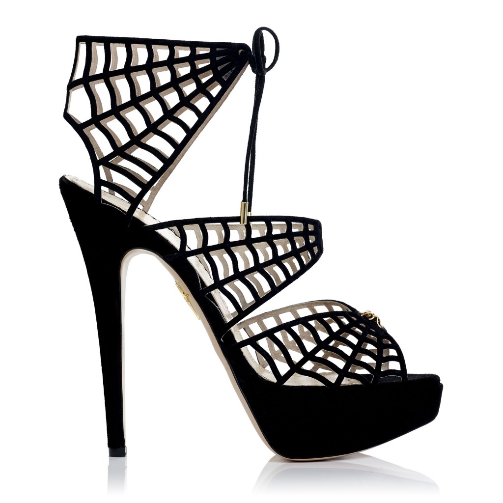 Laissez-vous piéger par les talons vertigineux des sandales en daim noir Caught in Charlotte’s web. Avec son design finement ouvragé qui n’est pas sans rappeler la fameuse toile, elles habilleront d’élégance les chevilles les plus délicates ! Désormais un classique d’Halloween, les escarpins Spider Dolly incrustées de petites araignées dorées sauront vous accompagner tout en douceur jusqu’au bout de la nuit.