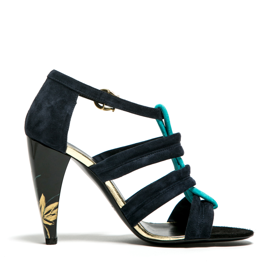 Michel Vivien nous invite au voyage avec des sandales aux teintes de lagunes. Le soyeux du velours, les fleurs lascives et laquées du talon en bois laqué peint à la main, nous immergent dans le mood for love...