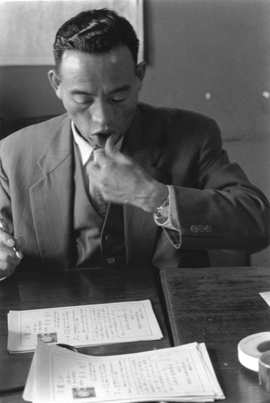 Le photographe japonais le suit dans ses pérégrinations quotidiennes et garde en mémoire les interrogatoires, prises de notes, coups de fil.