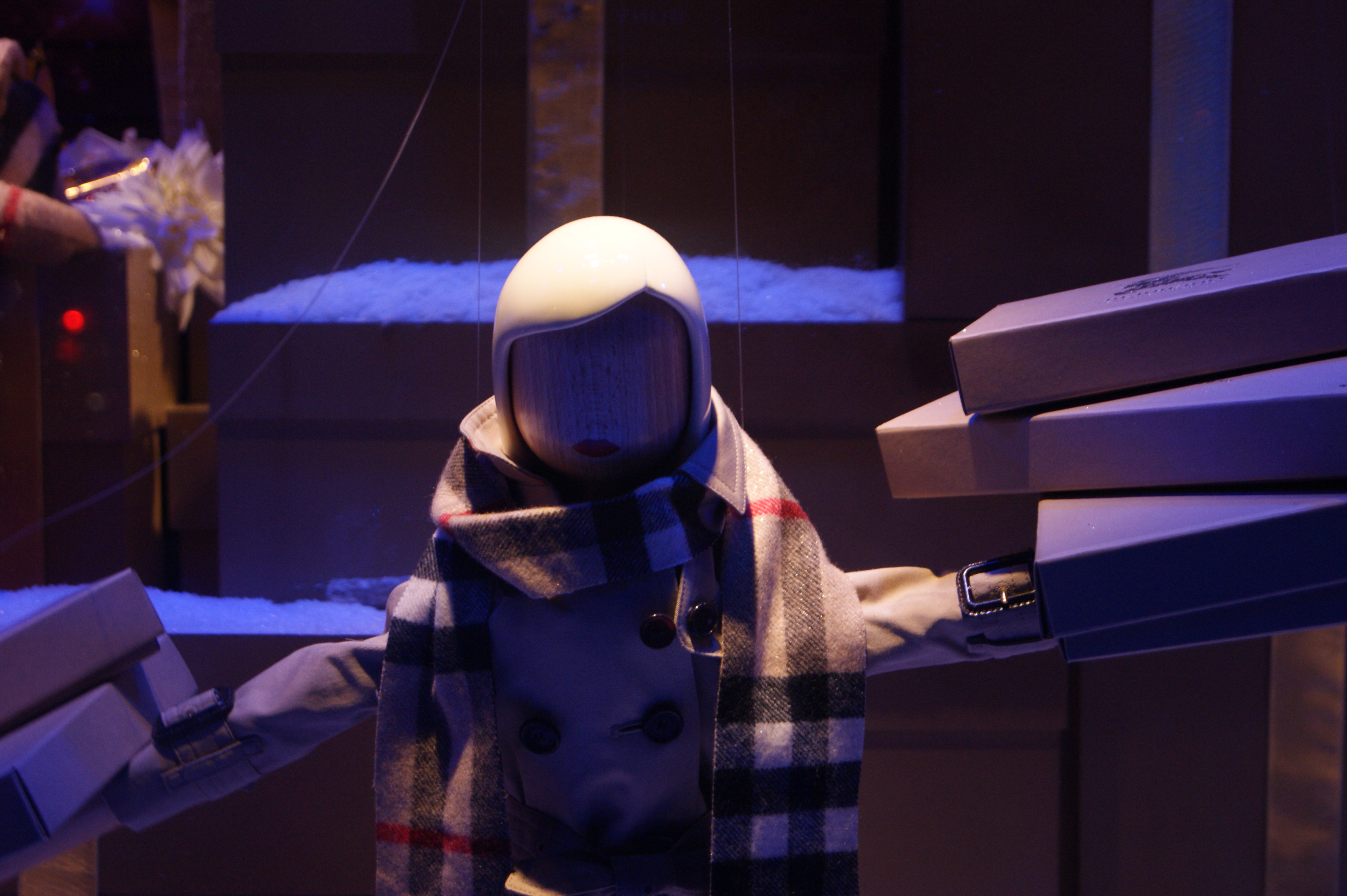 Et hop ! Un mur de paquets s’ouvre, les Marionnettes Anglaises de la Maison Burberry s’animent d’une joyeuse frénésie et la multitude de boîtes dorées s’ouvrent comme des fleurs.
