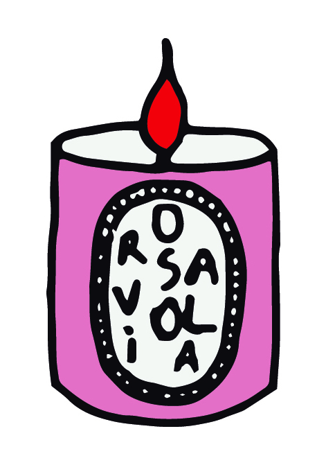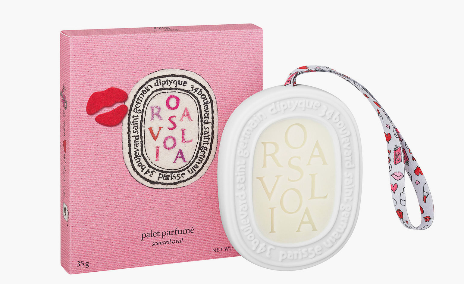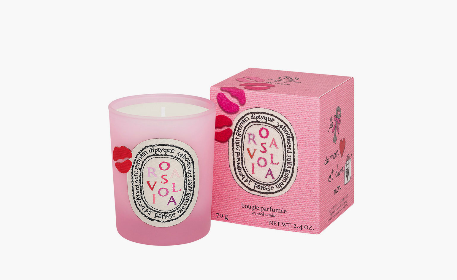 Pour la Saint-Valentin, Olympia Le-Tan dessine l’ovale Eau Rose façon point de croix et habille la collection Rosaviola d’illustrations reprenant son univers. La bougie, mêlant la rose et la violette, s’habille d’un ovale en tissu brodé, que la créatrice a marqué d’un baiser.