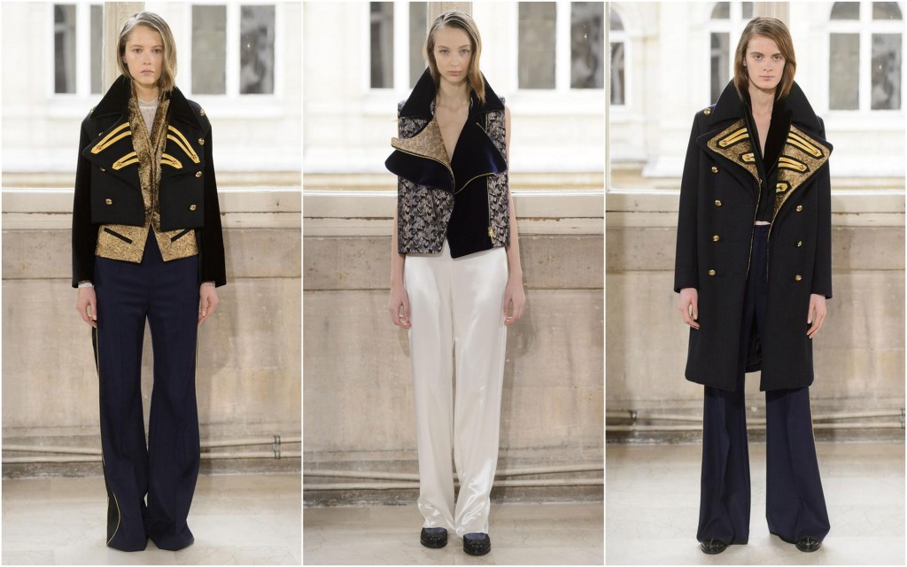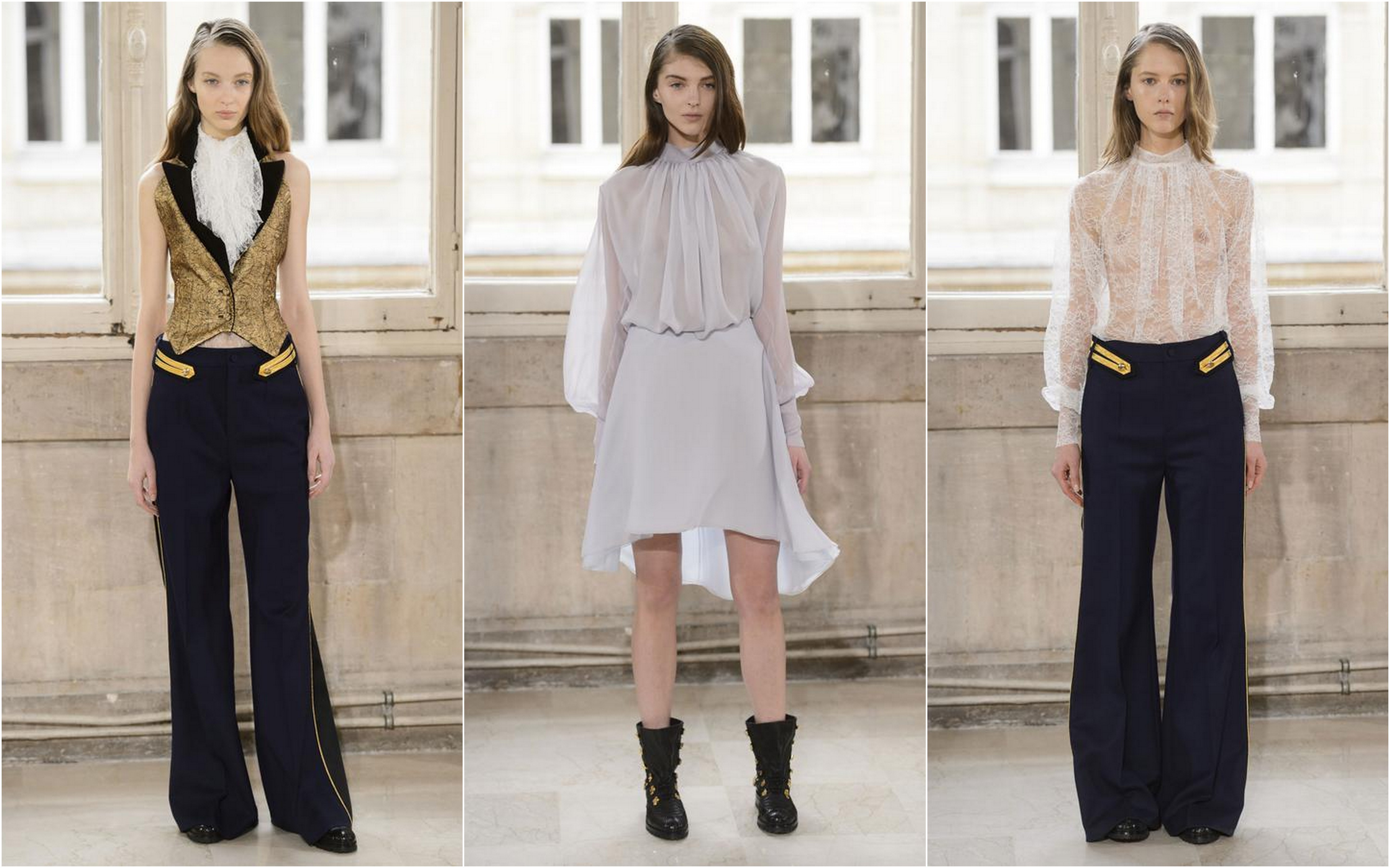 Les pantalons de moussaillon chic prennent le très large, et s’acoquinent avec un jabot de dentelles ou une blouse victorienne transparente, tandis que la virilité des cabans se frotte à l’extrême délicatesse de robes en soie que l’on croirait liquide.