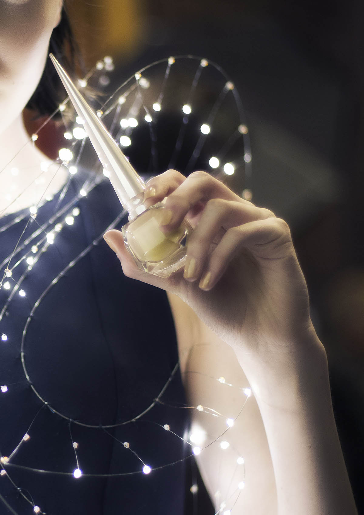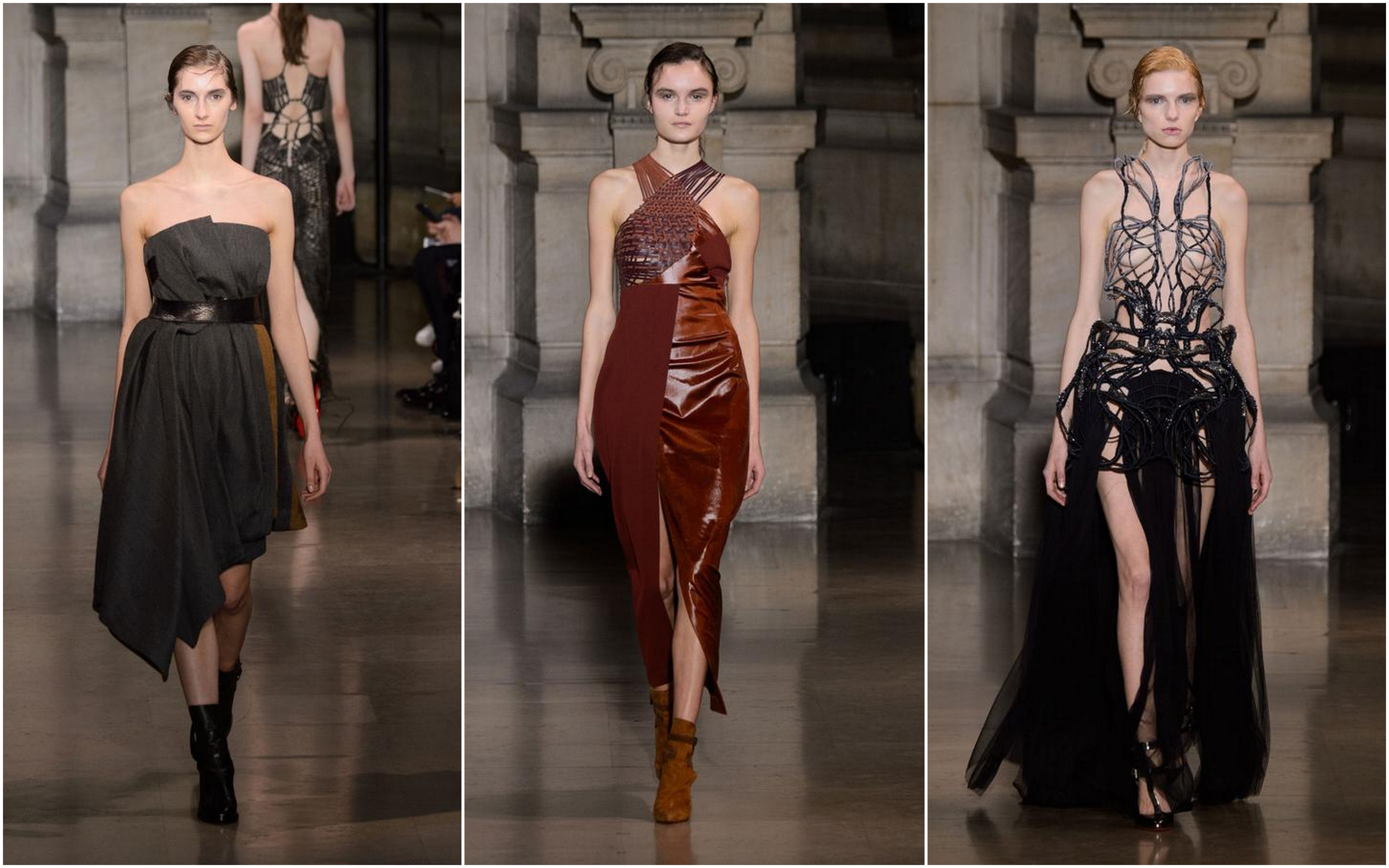 Des déesses dont la mythologie est encore à inventer s’avancent, sanglées de cuir tressé, abritées par des écailles de cuir découpées au laser par le créateur textile Coen Carsten, ou tapie dans une robe en LED et cordes de piano, créée avec le sculpteur Bastien Carré.