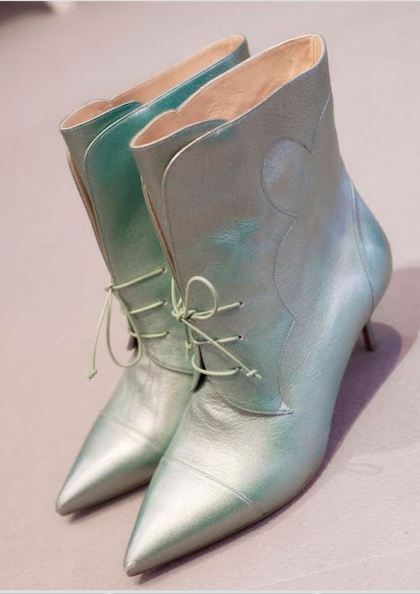 Christian Louboutin ajoute, pour sa part, une cerise acidulée sur ce gâteau disco-baroque, avec de hautes bottes de néo-cosaque en cuir noir à tige souple, des boots lacées en cuir métallisé ou à finition perlée, qui rivalisent d’espièglerie avec les escarpins à talons de 5cm en cuir noir ou blanc, dont le décolleté est délicatement crocheté de coton ton sur ton.
