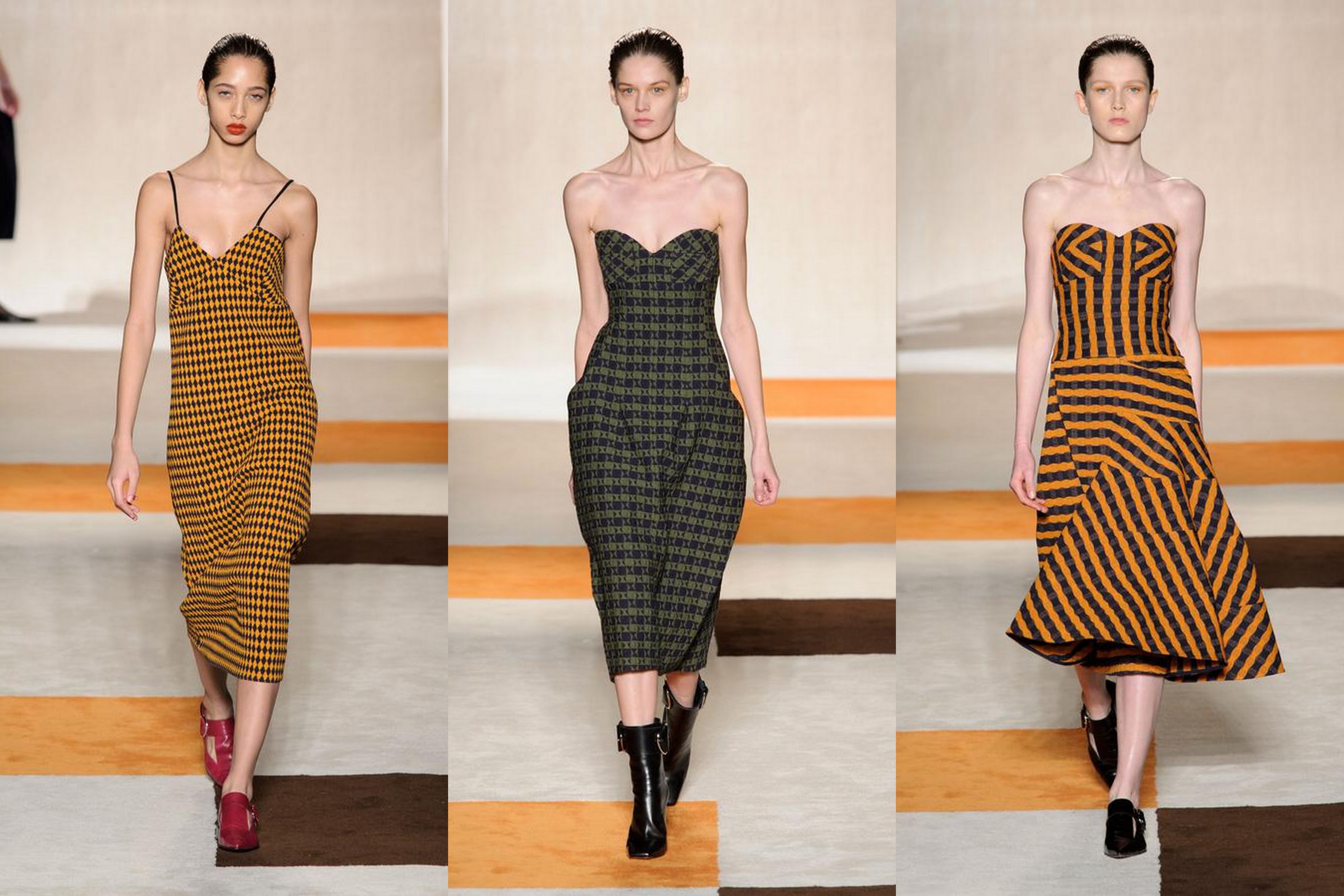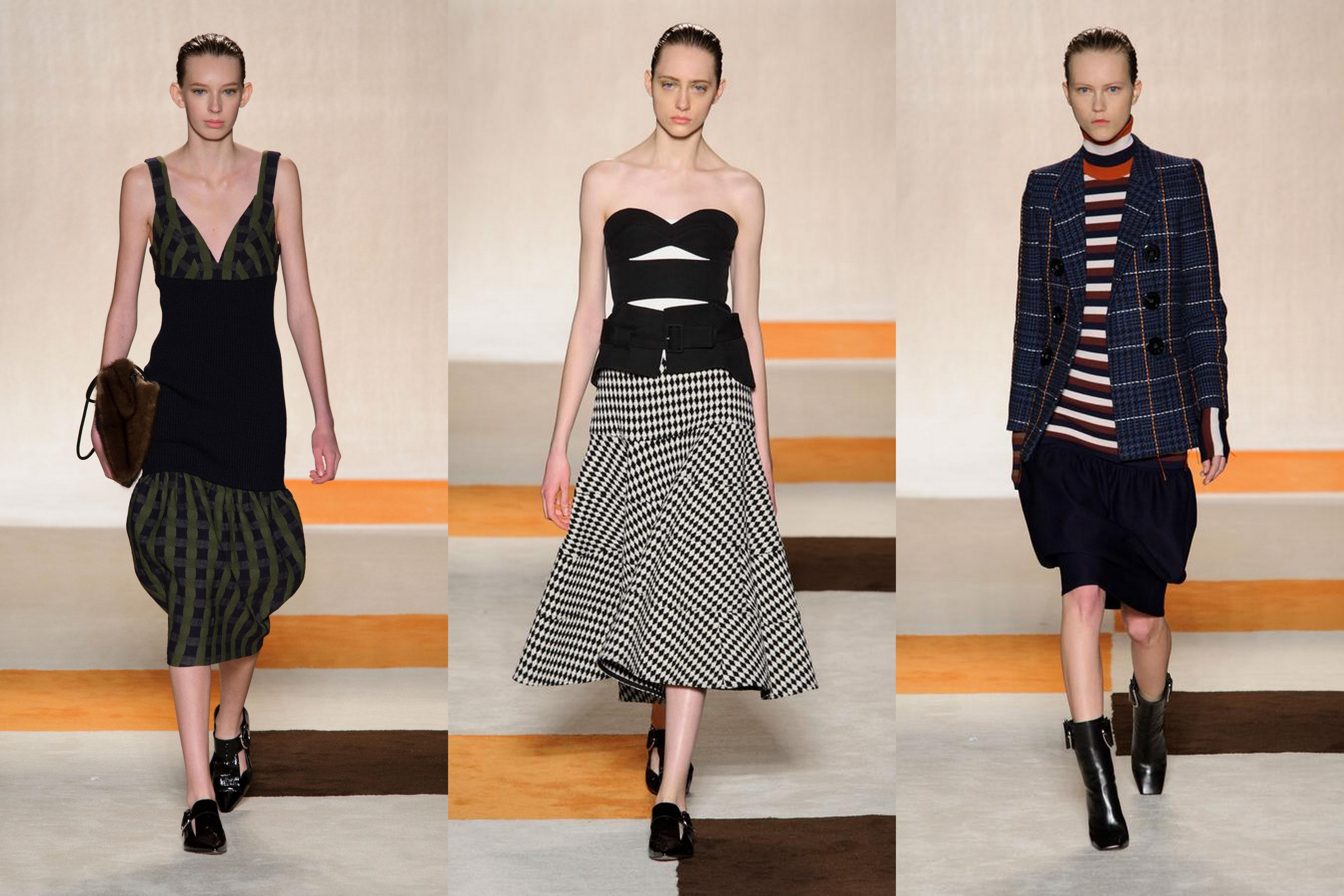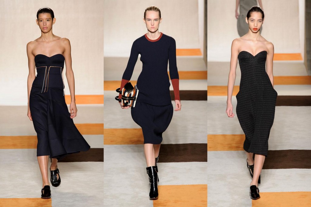 Les silhouettes oscillent entre des ensembles en laine près du corps allongeant la silhouette, des jupes trapèze aux proportions nouvelles, des pièces aux volumes ballon et des robes bustiers épurées.