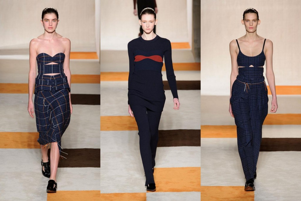 Le bustier, pièce phare du défilé clin d’oeil aux premières robes corset de la créatrice, se porte avec des pantalons à taille haute librement inspiré du dressing masculin quand il ne se décline pas en trompe-l’oeil sur des pulls graphiques ou des robes.