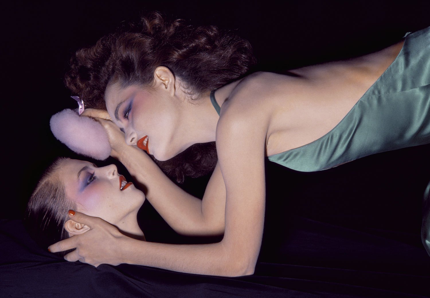 Provocatrices, certaines sont l’expression assumée de la sensualité et du désir. Ici, un bâton de rouge à lèvres devient un palliatif symbolique quand une autre se cambre en effleurant ses pistils. Là, tel Narcisse tombant amoureux de son propre reflet, une femme repoudre le visage d’une autre dont le maquillage est identique au sien et approche ses lèvres de l’autre.