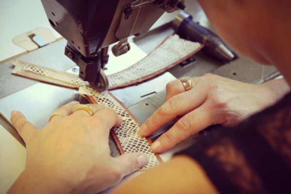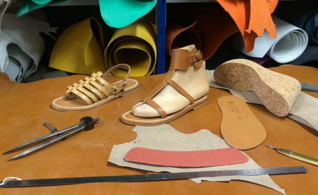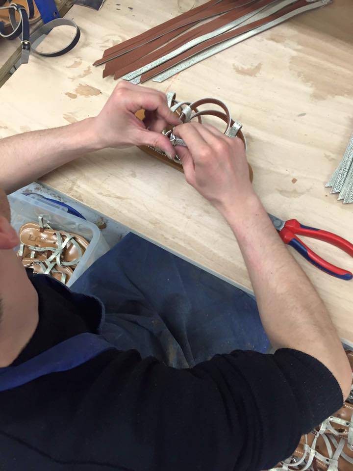 Le cycle de production démarre à partir d’une grande peau, et c’est alors que la sandale se fabrique sur une semelle double, d’intérieur dite première et semelle extérieure dite d’usure. Soixante minutes de travail sont nécessaires par modèle, quarante-six opérations différentes sont assurées par les mains des 28 artisans dans les ateliers.