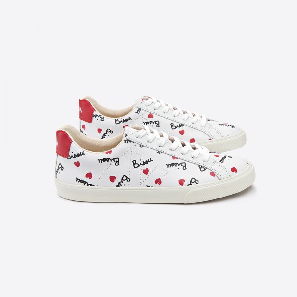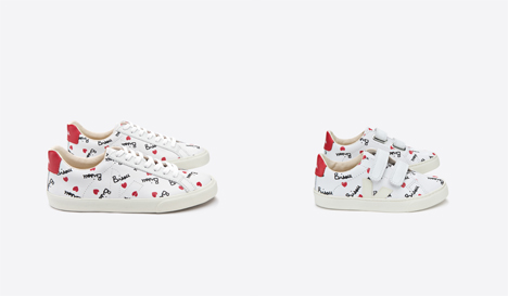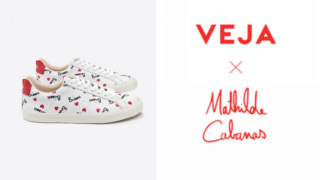 Pour Veja, Mathilde Cabanas a imaginé un joli motif pour habiller le modèle Esplar (109€) et nous inonder de bisous. Un modèle ainsi nommé en l’honneur de l’ONG brésilienne Esplar avec qui Veja travaille et qui soutient l’agriculture biologique et familiale dans la région du Nordeste.
