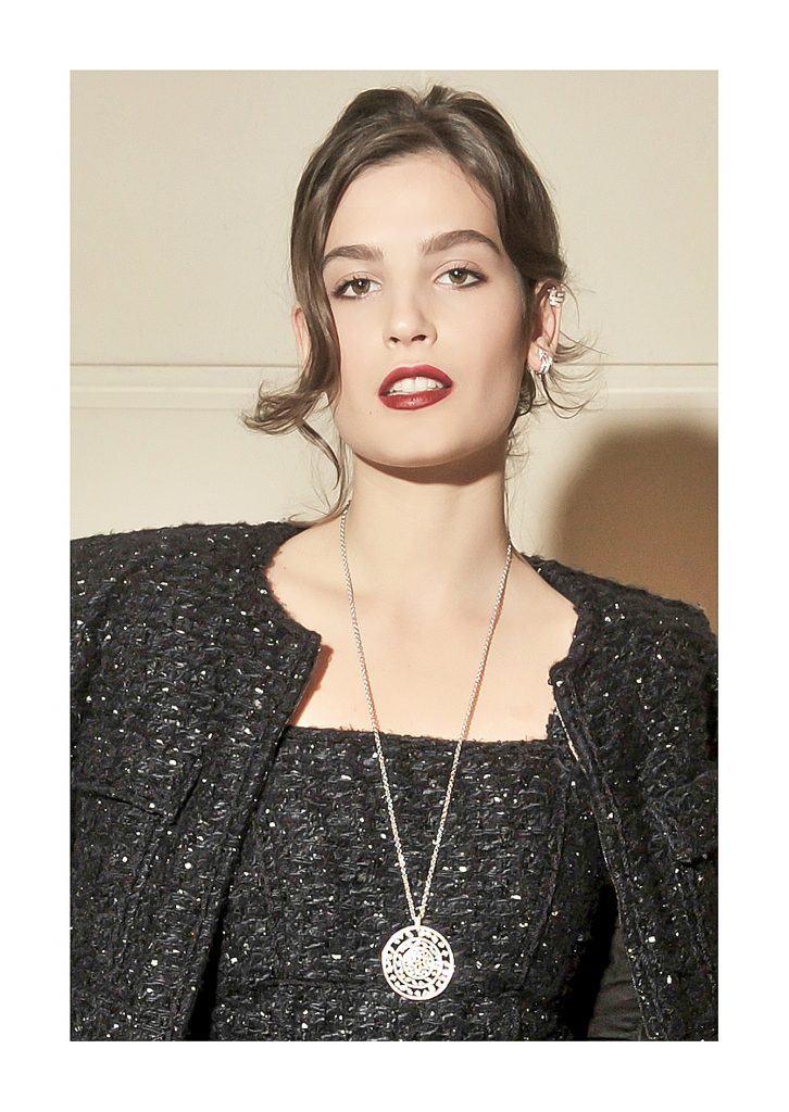 Alma JODOROWSKY portait un pendentif Etoile Filante en or blanc 18K et diamants et des boucles d’oreilles Comète Spirale en or blanc 18K et diamants Chanel Joaillerie sur une combinaison et un manteau Chanel issus de la collection Haute Couture Automne-Hiver 2016/17.