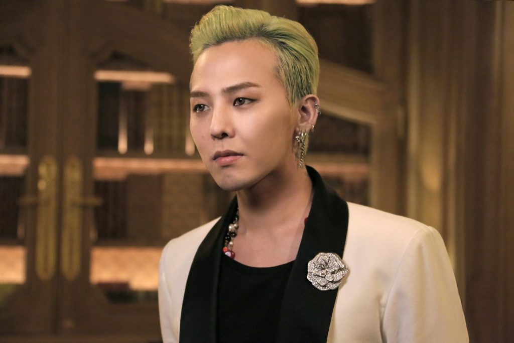 G-DRAGON portait une broche Ruban de Camélia en or blanc 18K diamants et spinelles noires Chanel Joaillerie sur une veste issue de la collection croisière 2016-2017.