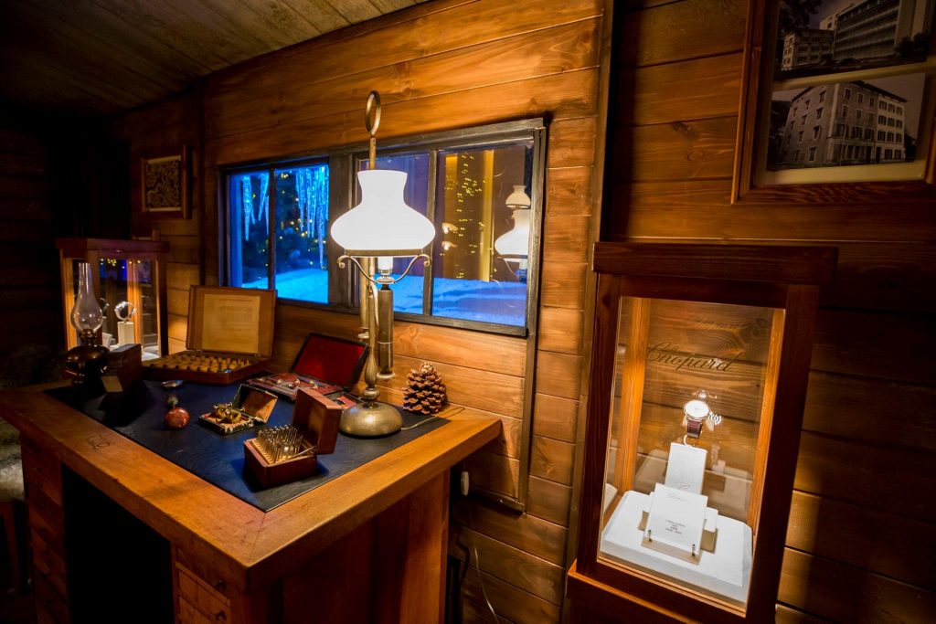 Deux modèles intemporels de montres Chopard sont exposés au sein du Chalet : la L.U.C XPS 1860 en or rose, modèle extra-plat pour hommes avec un mouvement issu de la manufacture L.U.C située à Fleurier ainsi que le modèle féminin Happy Sport en acier avec bracelets en caoutchouc interchangeables.
