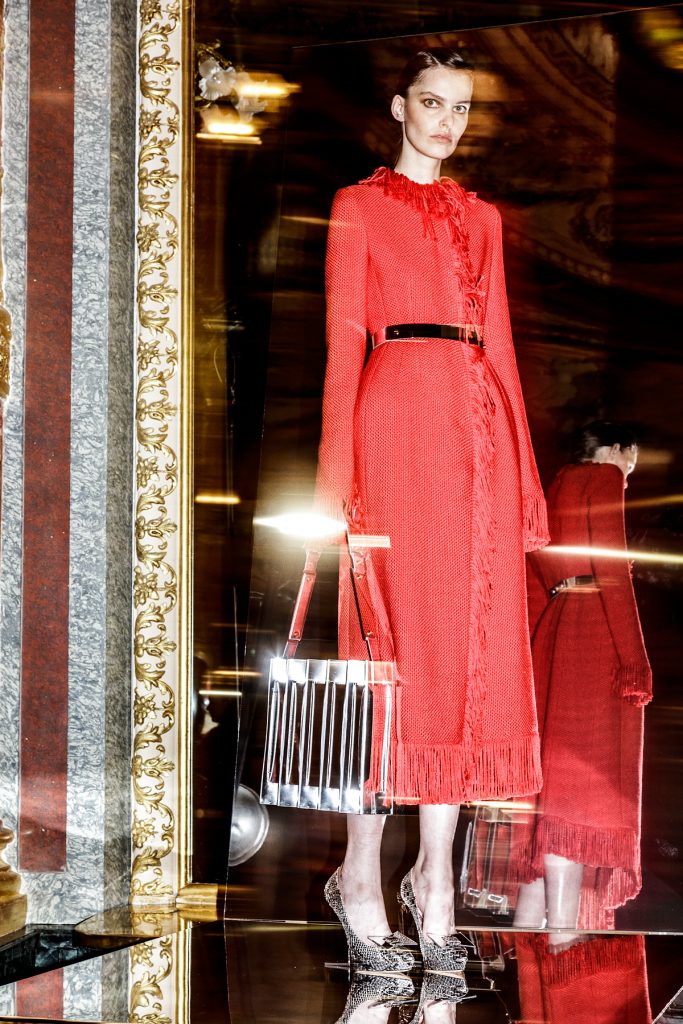 PARIS, FRANCE – FEBRUARY 28: Models pose during the Paule Ka Presentation as part of the Paris Fashion Week Womenswear Fall/Winter 2017/2018 at Hotel Intercontinental on February 28, 2017 in Paris, France. (Photo by Dominique Charriau/Getty Images for Paule Ka)Une glace coupe les replis d’un cabas en cuir; le cuir réfléchissant d’une pochette se fait origami pour mieux attirer l’oeil. Partout, les surfaces polies sont telles une psyché reflétant les multiples facettes de la femme. Ici et là, les éclats de lumière ponctuent les détails finement ciselés.
