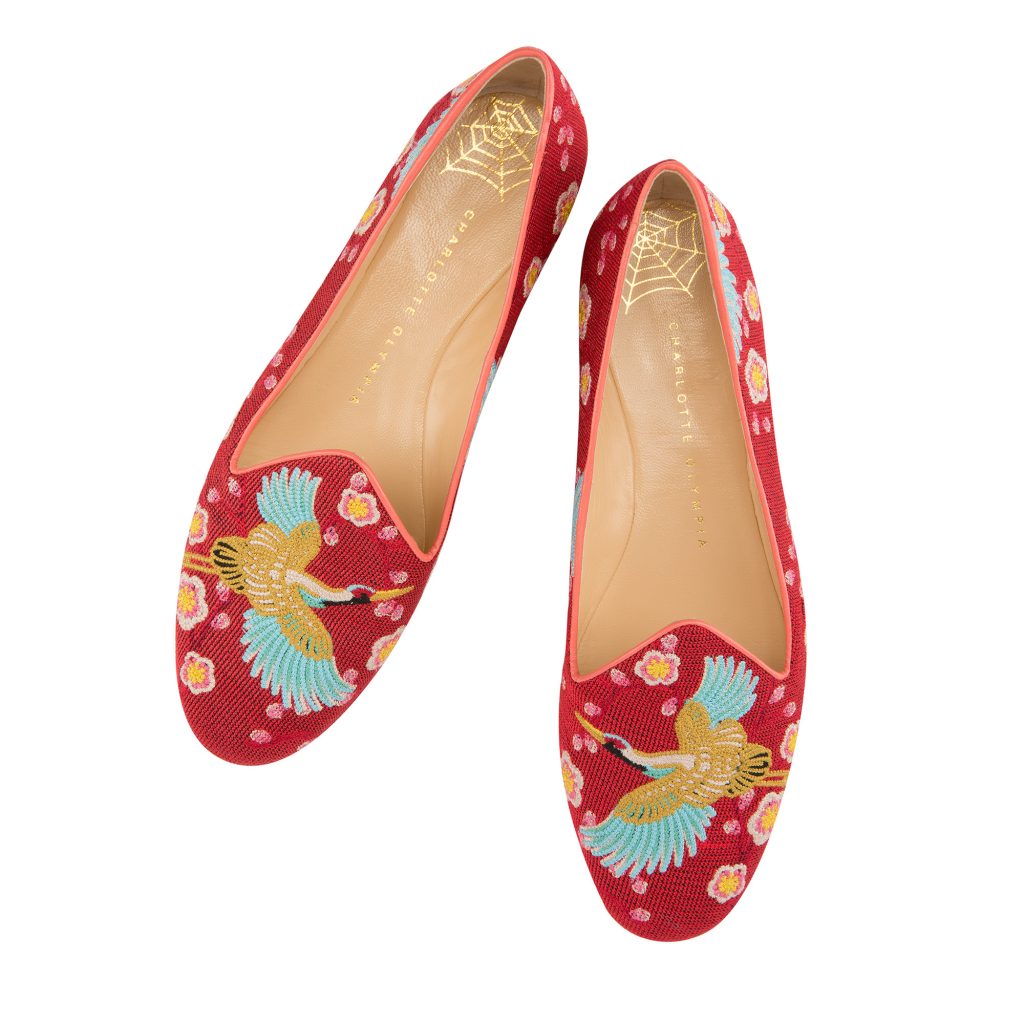 Et parce qu’une valise se doit d’être bien remplie, Charlotte Olympia a imaginé une collection de slippers baptisée Wish you were here, dont les broderies s’inspirent de multiples références au voyage comme la Statue de la Liberté, des dragons chinois, des poupées russes ou encore des roses anglaises. Délicats et finement brodés, ces slippers sont parfaits pour voyager avec élégance et sillonner les quatre coins du globe avec style..