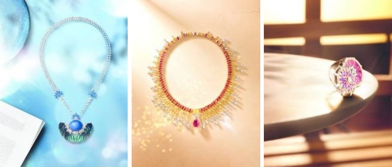 Chaque heure produit ainsi sa lumière et son humeur où s’épanouissent des créations joaillières et horlogères, éclatantes de couleur grâce à l’utilisation de pierres exceptionnelles telles que les saphirs bleus et les diamants jaunes.