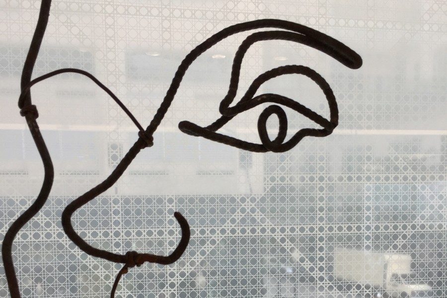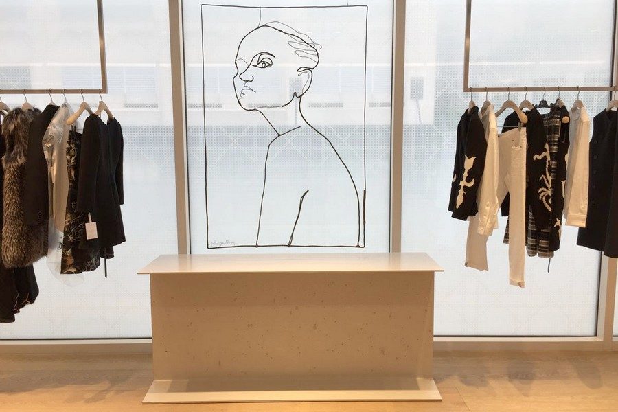 La sculpture, exposée de façon permanente au premier étage de la boutique, symbolise l’élégance intemporelle et l’innovation de cette maison de mode iconique. Les jeux d’ombre et de lumière se prolongent dans le travail de l’artiste avec ses dernières installations en néon et son projet de dessins filigranés.