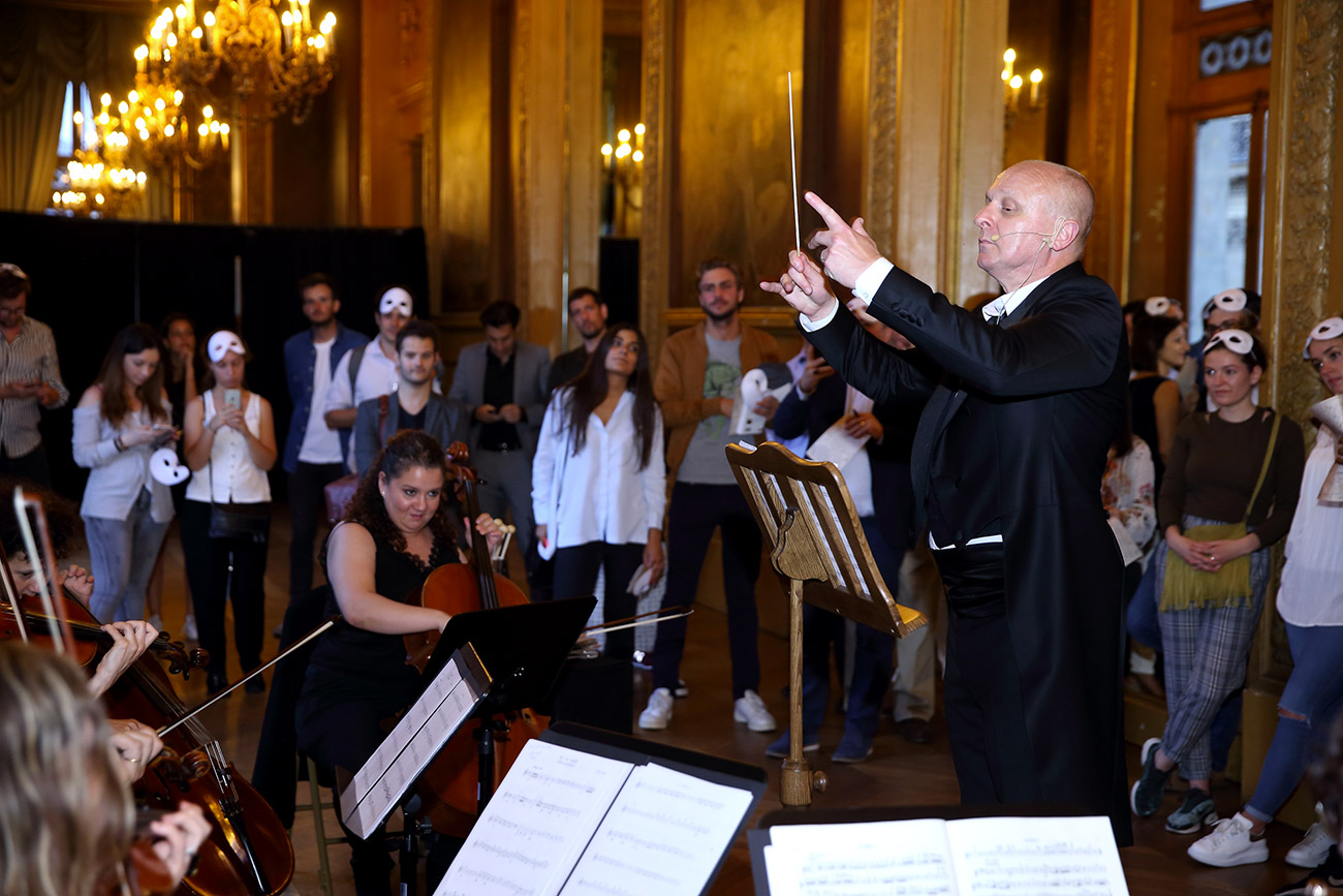 Munis d’un masque et d’une carte, les participants ont une heure pour accomplir la mission qui leur est confiée en déambulant dans les espaces emblématiques du monument historique : le Grand Escalier, l’Avant Foyer, le Grand Foyer ; la Galerie du Glacier, le Salon du Glacier ainsi que la loge du Fantôme de l’Opéra.