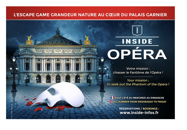 En collaboration avec Team Break, l’un des leaders du Live Escape Game, RERE et les Productions Adonis, l’un des monuments les plus mythiques au monde propose une aventure immersive unique : Inside Opéra, un jeu grandeur nature entre escape game et parcours immersif sur les traces du Fantôme de l’Opéra qui permet de découvrir autrement ce lieu.