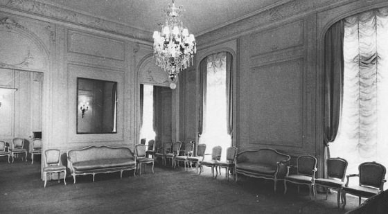 Cet hôtel particulier aux proportions idéales renferme tout l’esprit du couturier : des murs moulurés, des boiseries blanches, des miroirs dorés, des lustres en cristal, des nuances grisées, des chaises médaillons, des bouquets colorés parsemés ici et là et un mobilier néo-Louis XVI.