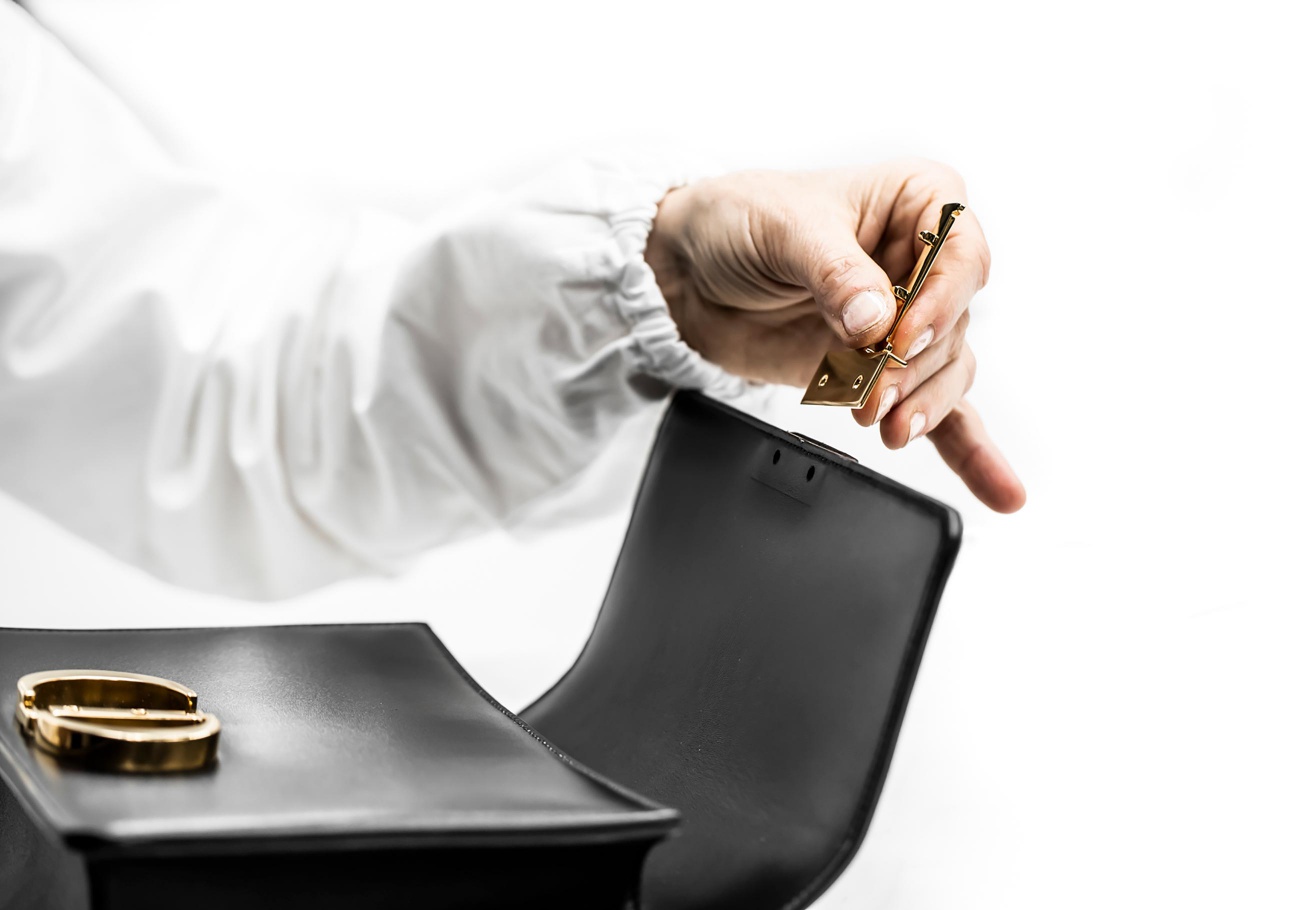 Son fermoir doré oversize en deux parties, reprenant les initiales du couturier, doit pouvoir s’ouvrir d’un simple geste.