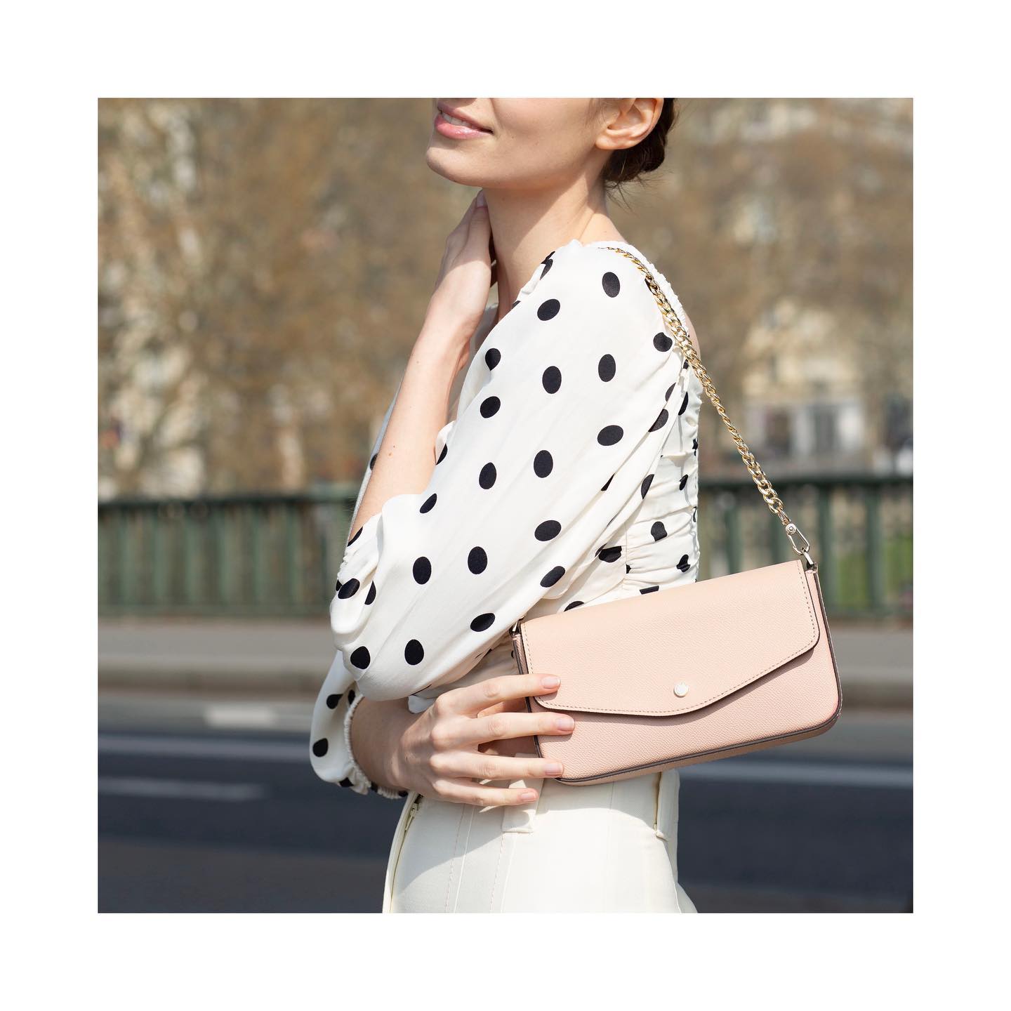 Avec sa délicate chaînette dorée, il vous accompagnera pour une pause déjeuner en terrasse et saura vous suivre jusqu’au bout de la nuit. Et pour une séance de shopping intense, la bandoulière amovible et ajustable en cuir coordonné vous offrira le confort de diverses autres façons de le porter.