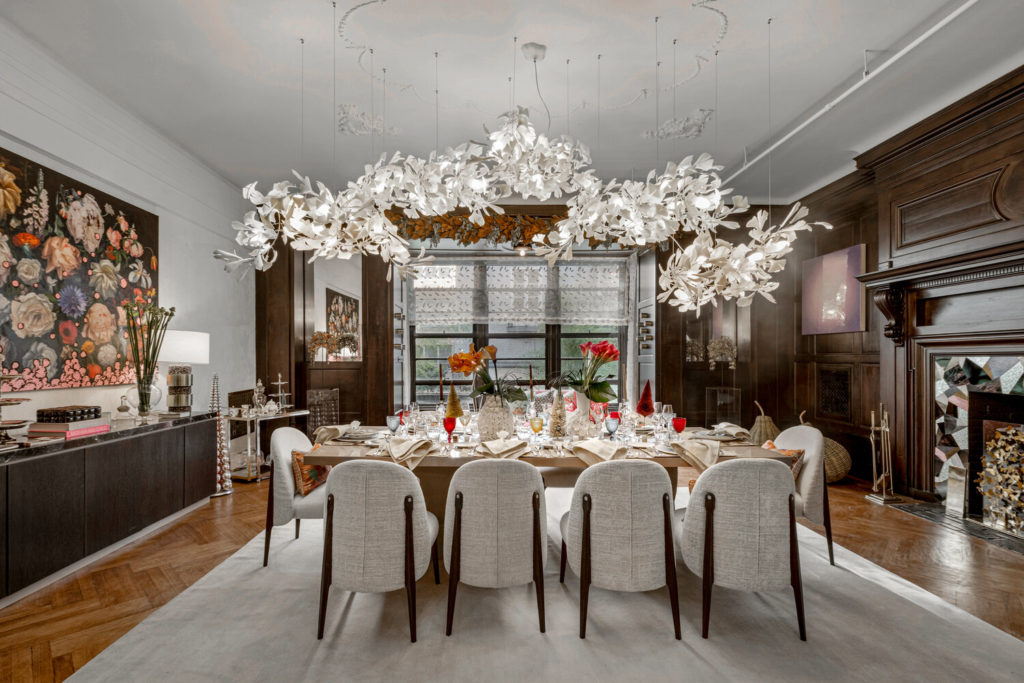 Ainsi la salle à manger du 1er étage a été aménagé par Elsa Soyars Interiors comme un très chic salon parisien aménagé pour les fêtes de Noël. A la fois salon de réception et salle à manger, cette espace de vie fonctionnel a été conçu comme un élément de mode à part entière, grâce à sa profusion de textures luxueuses.