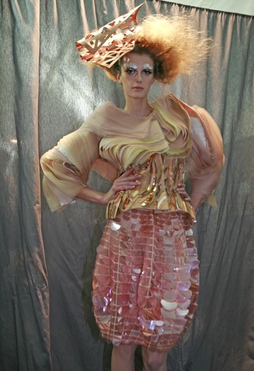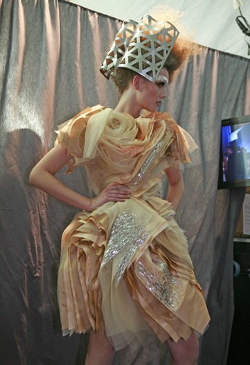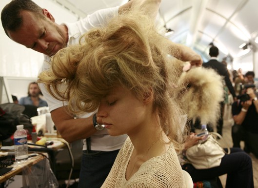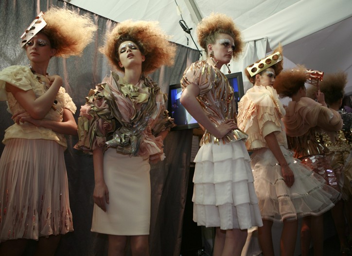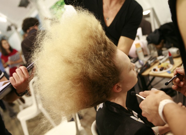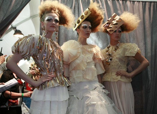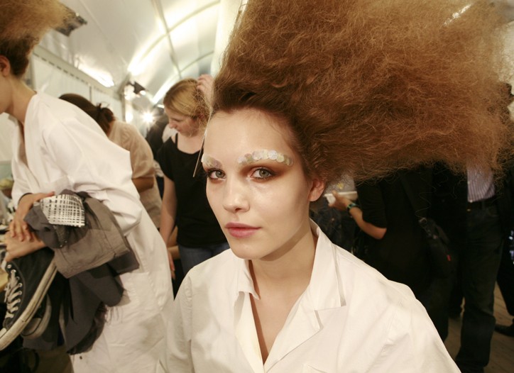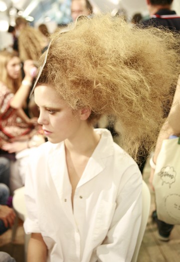 « Pour cela, nous avons crêpé à outrance les cheveux que nous avons ensuite travaillé autour de chapeaux géométriques, comme un cube ou une balle, pour le contraste » poursuivit le coiffeur, visiblement inspiré par le travail de l’architecte Franck Gehry. « C’est très sculptural, très architectural… » .