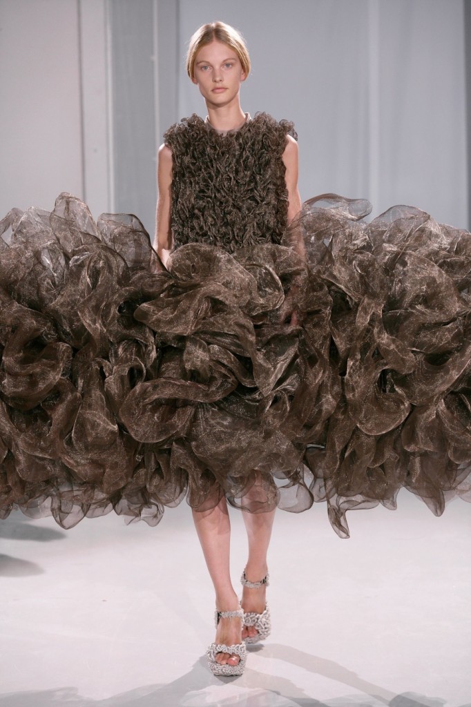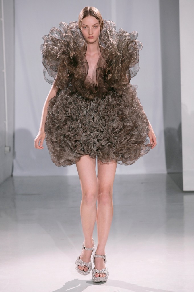 Iris Van Herpen a une approche futuriste de la mode. Ses modèles entre sculptures et vêtements sont sans conteste l’aboutissement d’une expression artistique au sens le plus noble du terme. On ne peut s’empêcher d’y voir l’influence d’Alexander McQueen – chez qui elle a fait ses classes – mais son style est résolument avant-gardiste, combinant très intelligemment les techniques artisanales et les meilleurs techniques 3D pour créer des œuvres d’art qui ont fasciné toute l’assemblée. Une artiste talentueuse à suivre !
