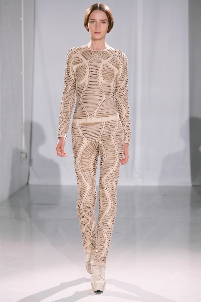 La créatrice a collaboré avec l’architecte Isaie Bloch et utilisé les techniques 3D de la marque .MGX de Materialise pour créer des pièces en polyamide aux reflets brillants et à la finition laquée. Formes d’oiseaux ou spirales nous emmènent au bord de la rêverie numérique pour former des semblants d’armures tri-dimensionnelles.